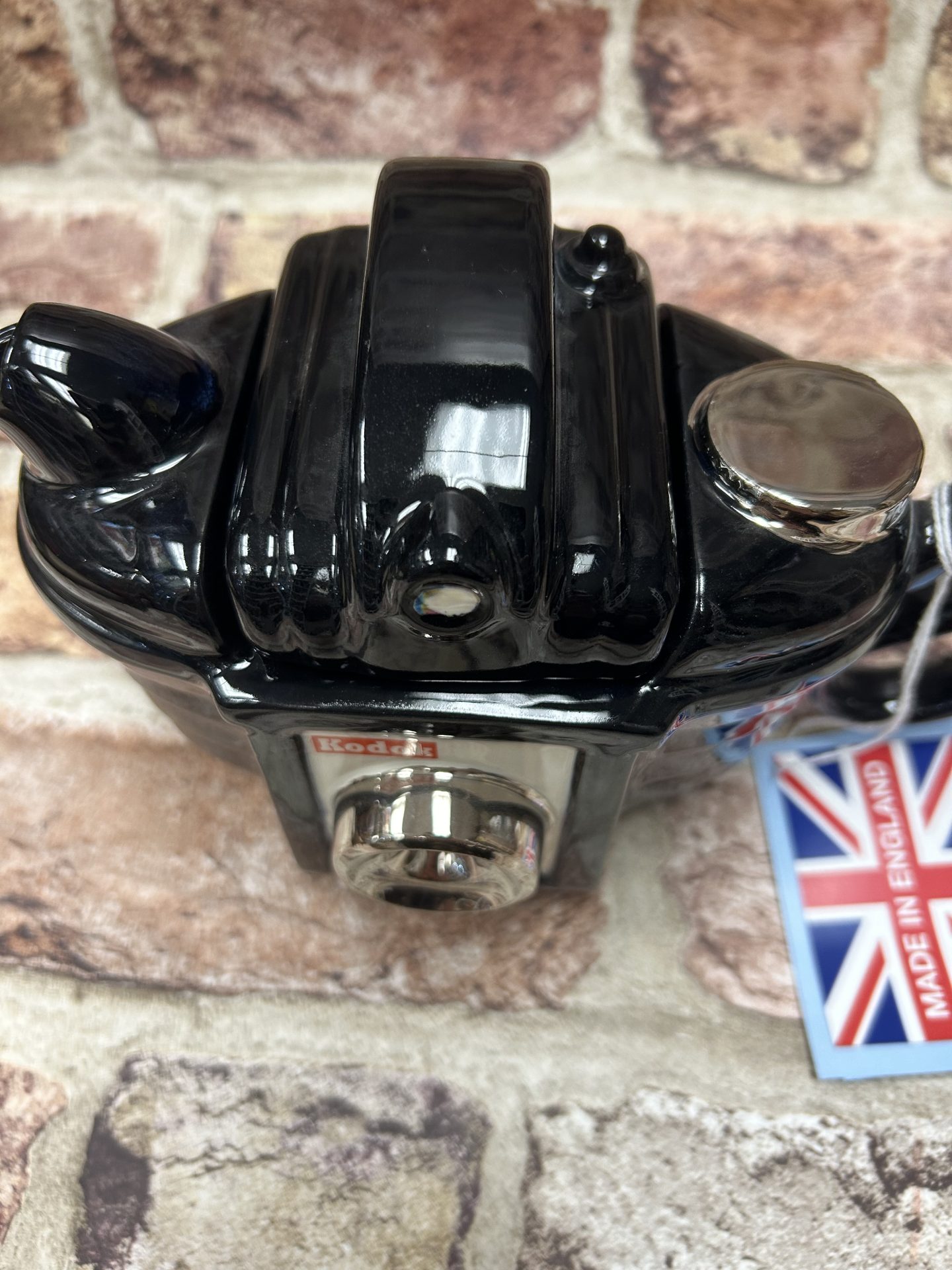 Camera designed tea pot which cleverly uses the handle to look like the camera strap.