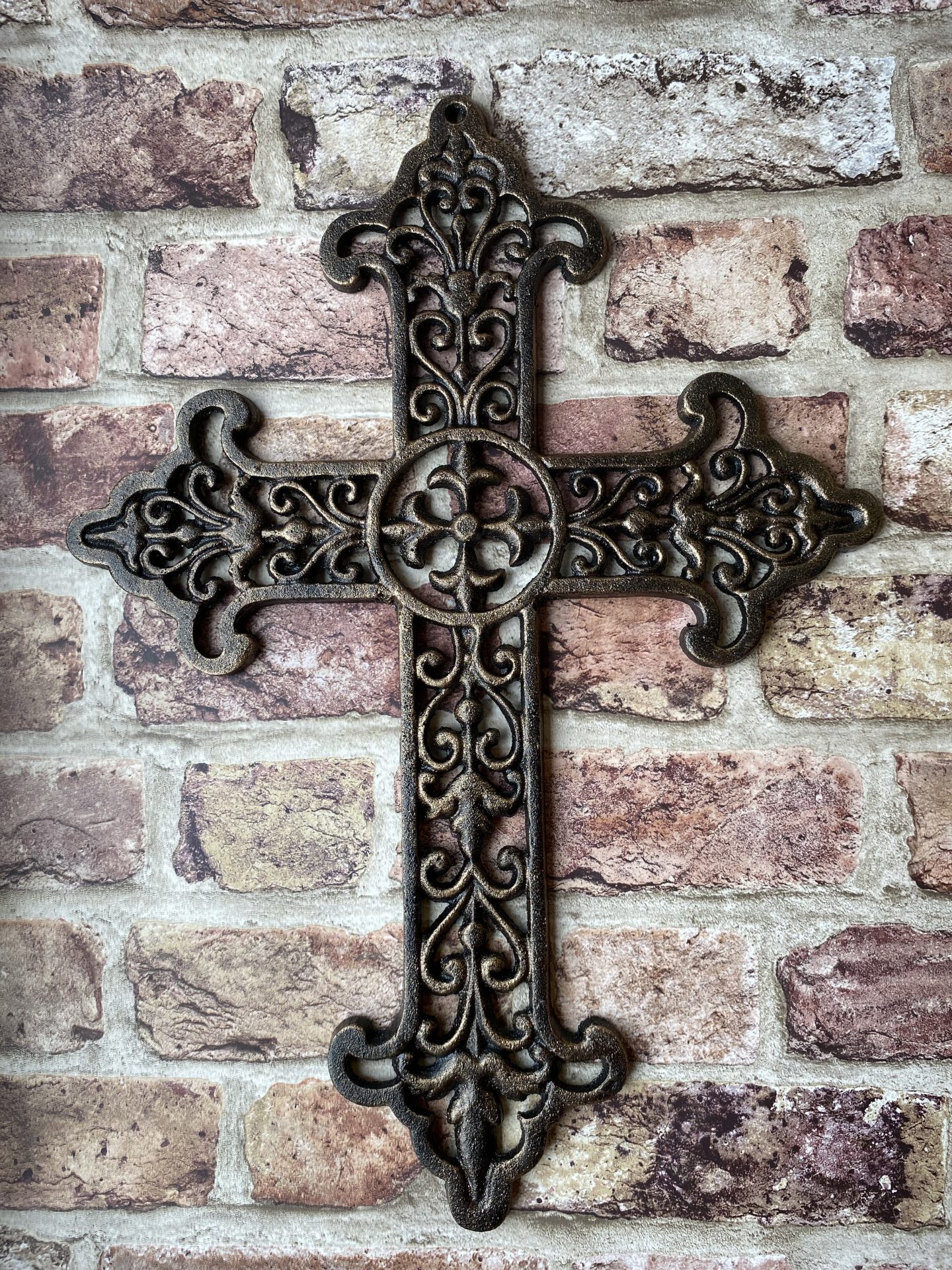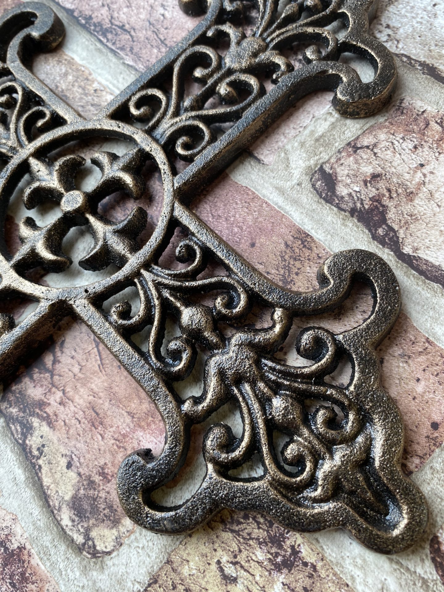 Large cast iron cross with intricate filigree pattern design. this cross displays an ornate openwork pattern, which contrasts beautifully with the cross’ sturdy cast iron construction.