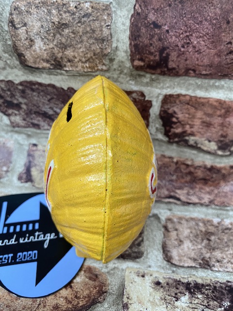 This cast iron moneybox features a vintage logo from Shell oil company. This “scallop” version of the logo came into use in Shell advertising campaigns during the 1940s. The moneybox is finished in hand painted brand yellow, with raised red and white lettering. You can deposit coins into the bank via a slot at the top. This item is great as a moneybox but vintage auto enthusiasts will also like to use it as an ornament in its own right.