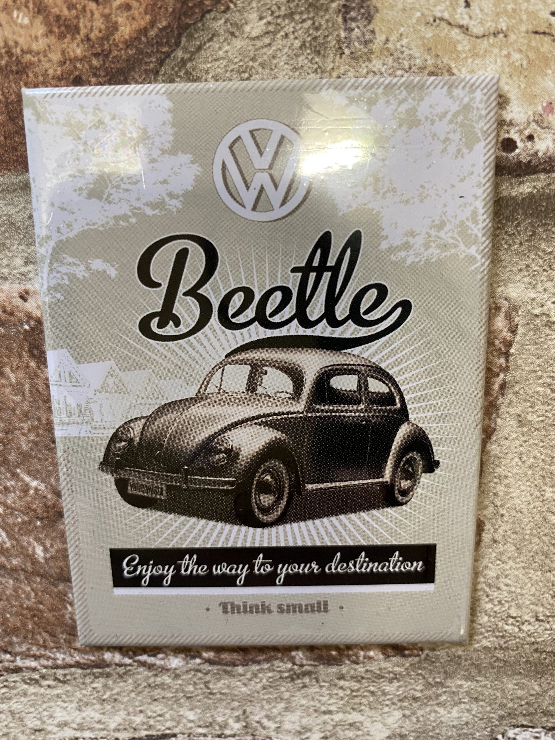 Classic retro VW Beetle fridge magnet. “Enjoy the way to your destination ”
