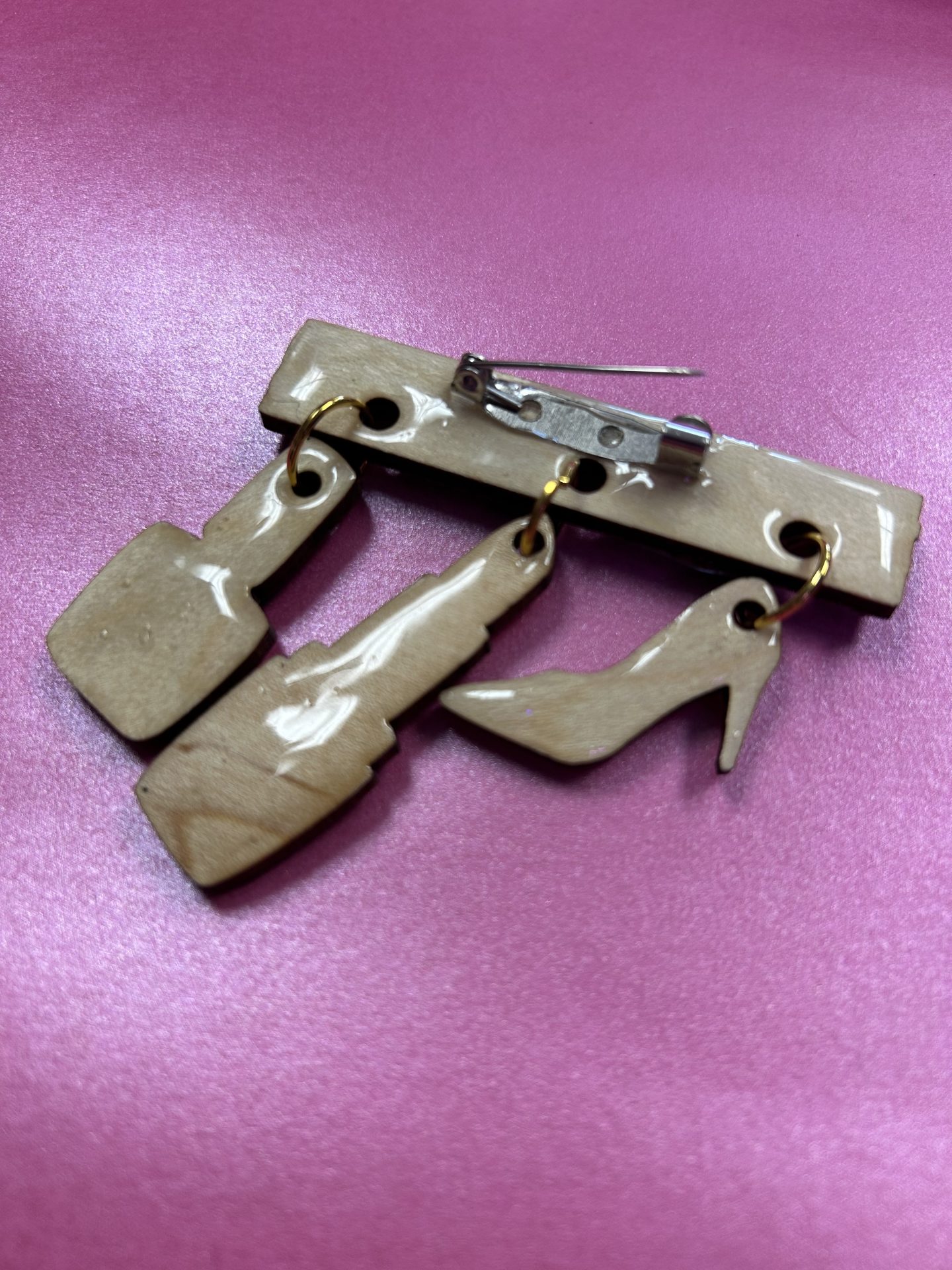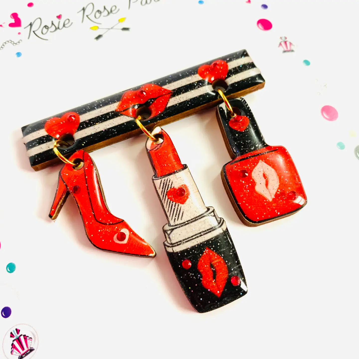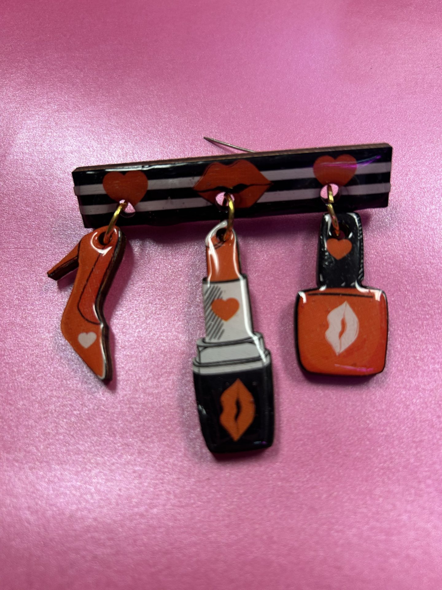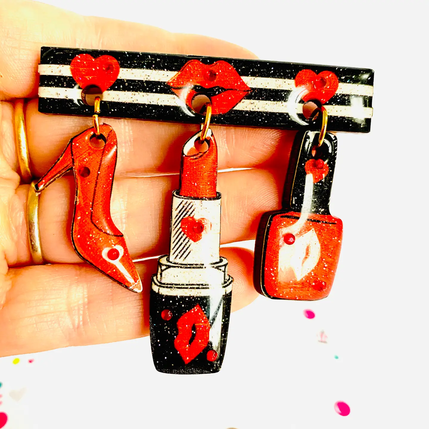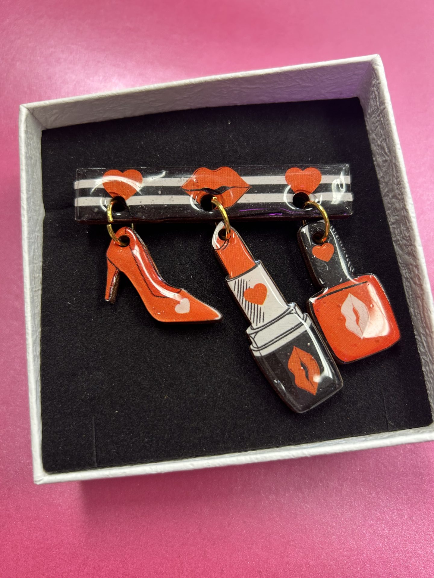 Unusual dangle heart retro style statement brooch. Makeup and heart themed brooch with a lipstick, nail polish and stiletto dangle components. Handmade with hard resin and added red ruby gems. colourful design, resin and wood.