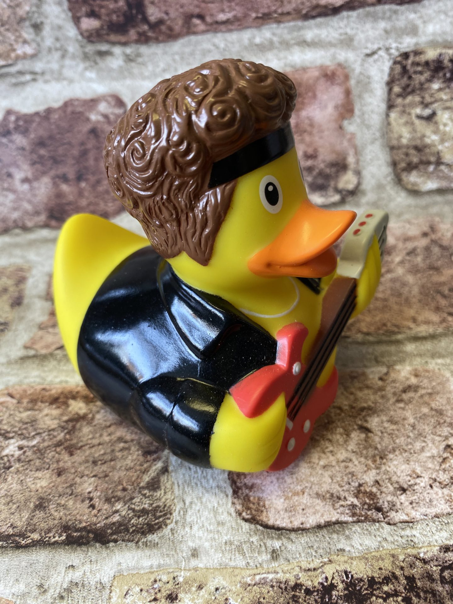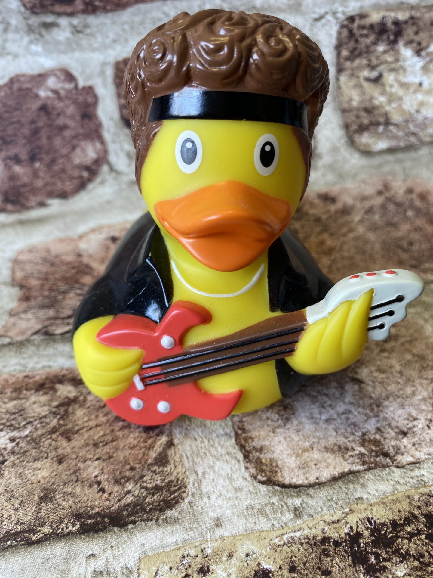 With guitar in hand and sporting a fine head of hair, black jacket & bandana , this duck is ready to rock!!