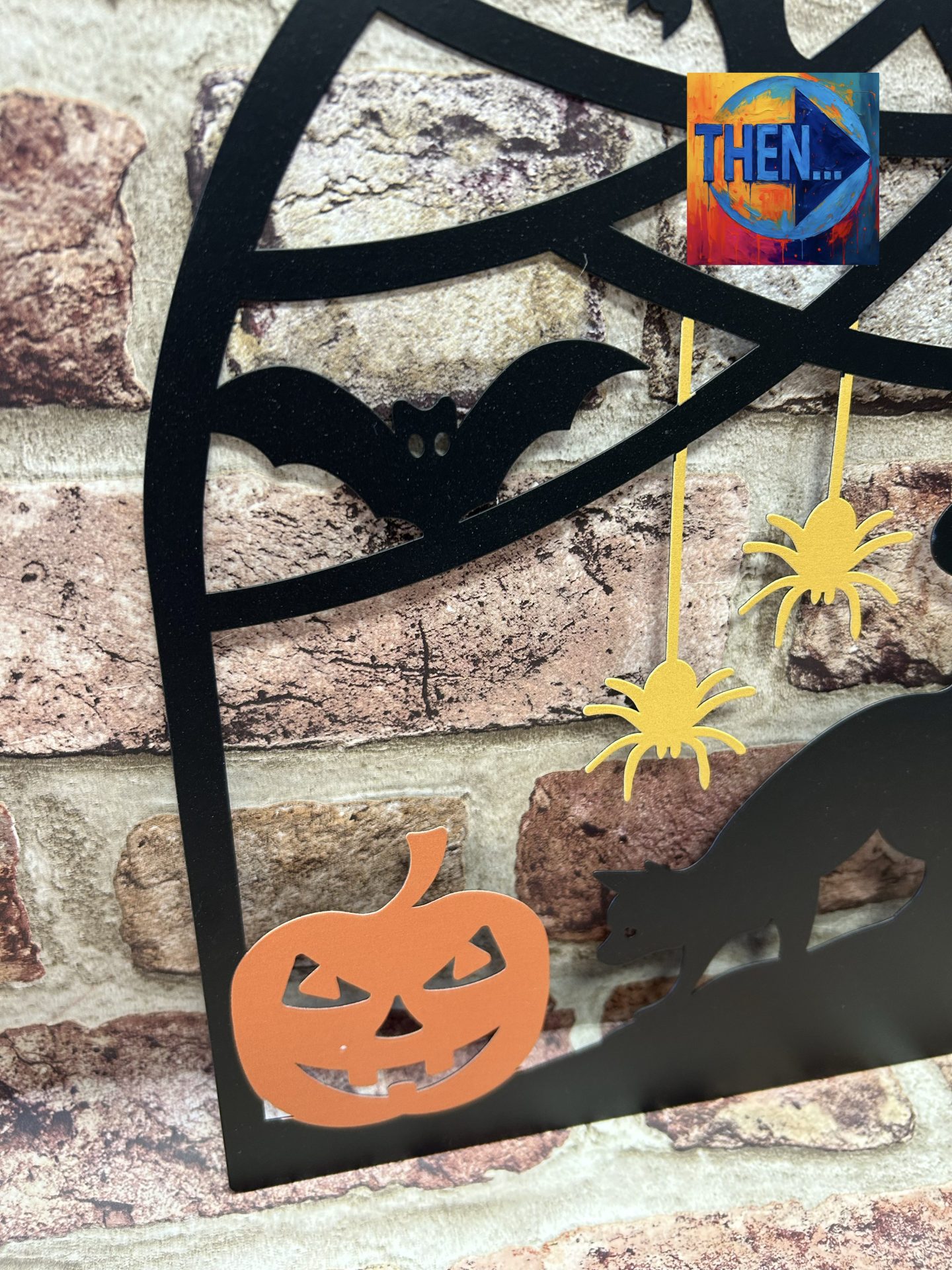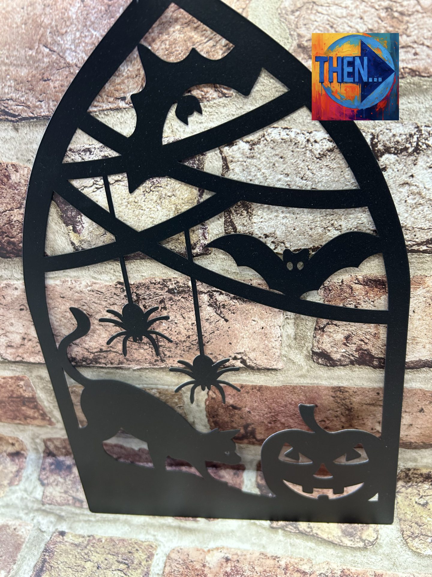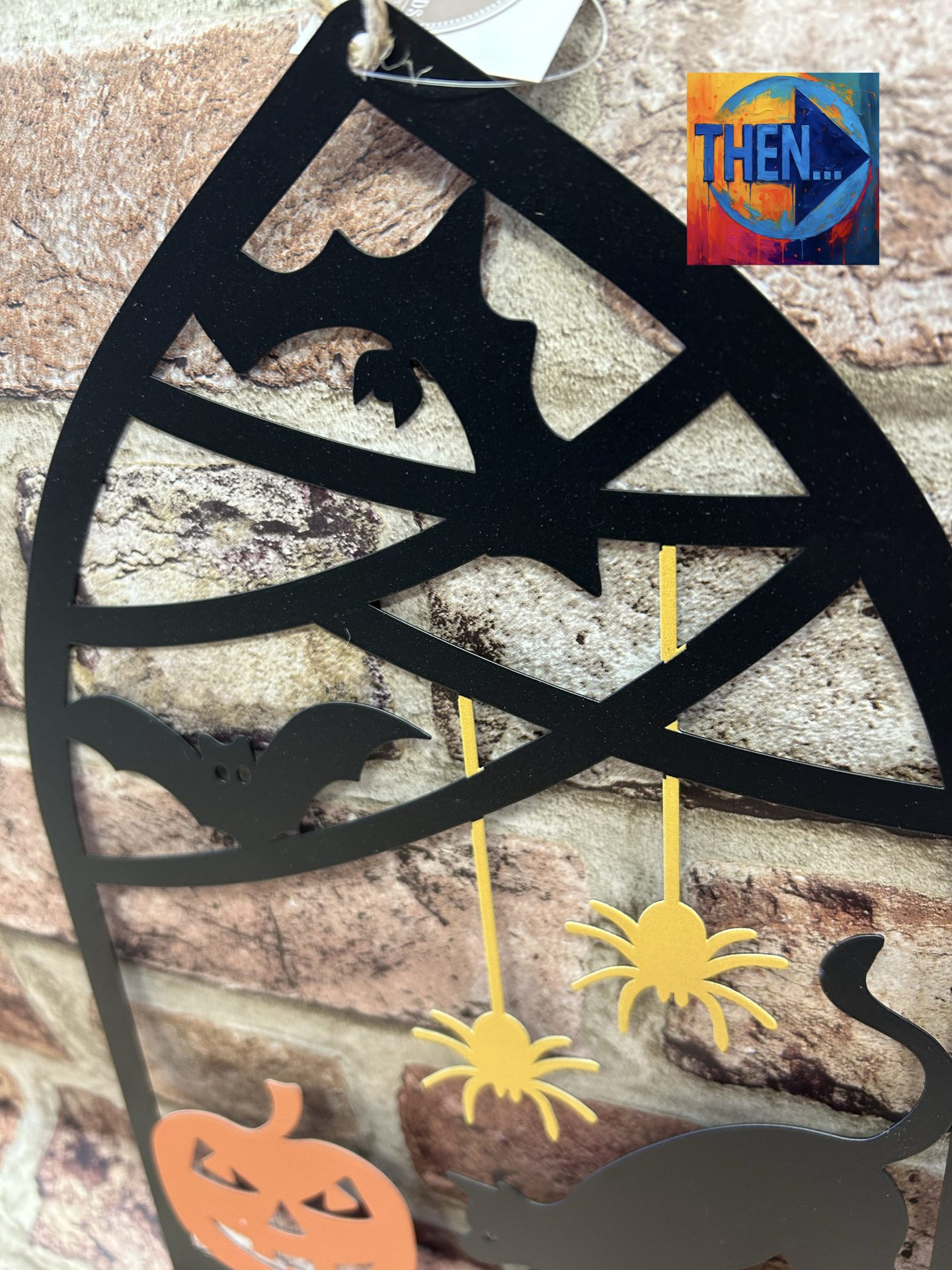 Hanging thin cut out metal Halloween window, with loop to hang. Style 1 with orange pumpkin design Perfect for Halloween decor.