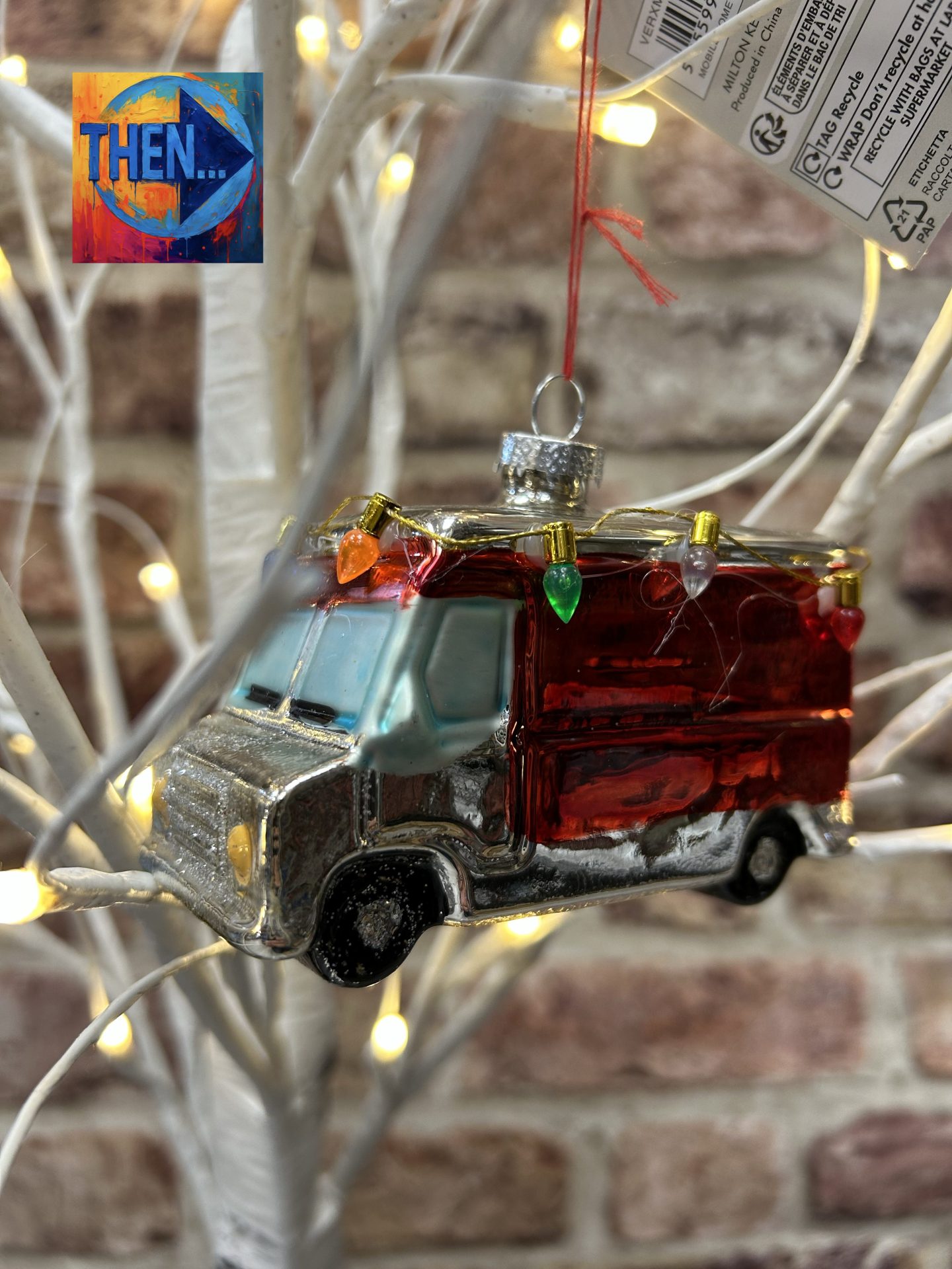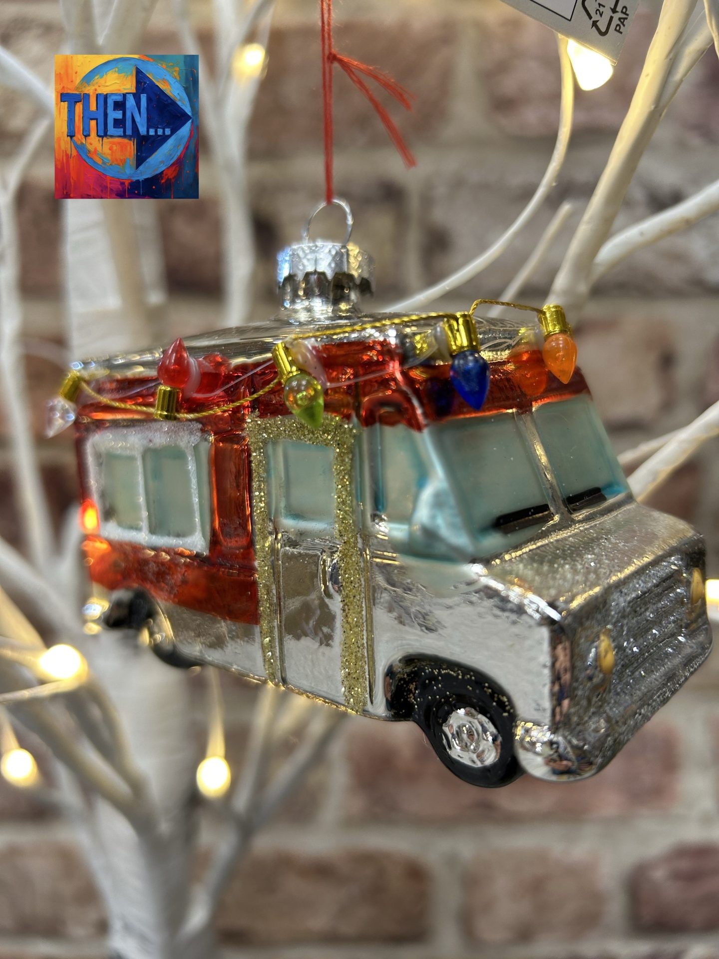 Mobile home with Christmas lights hanging around the roof Decorative Hanging Bauble Decoration.