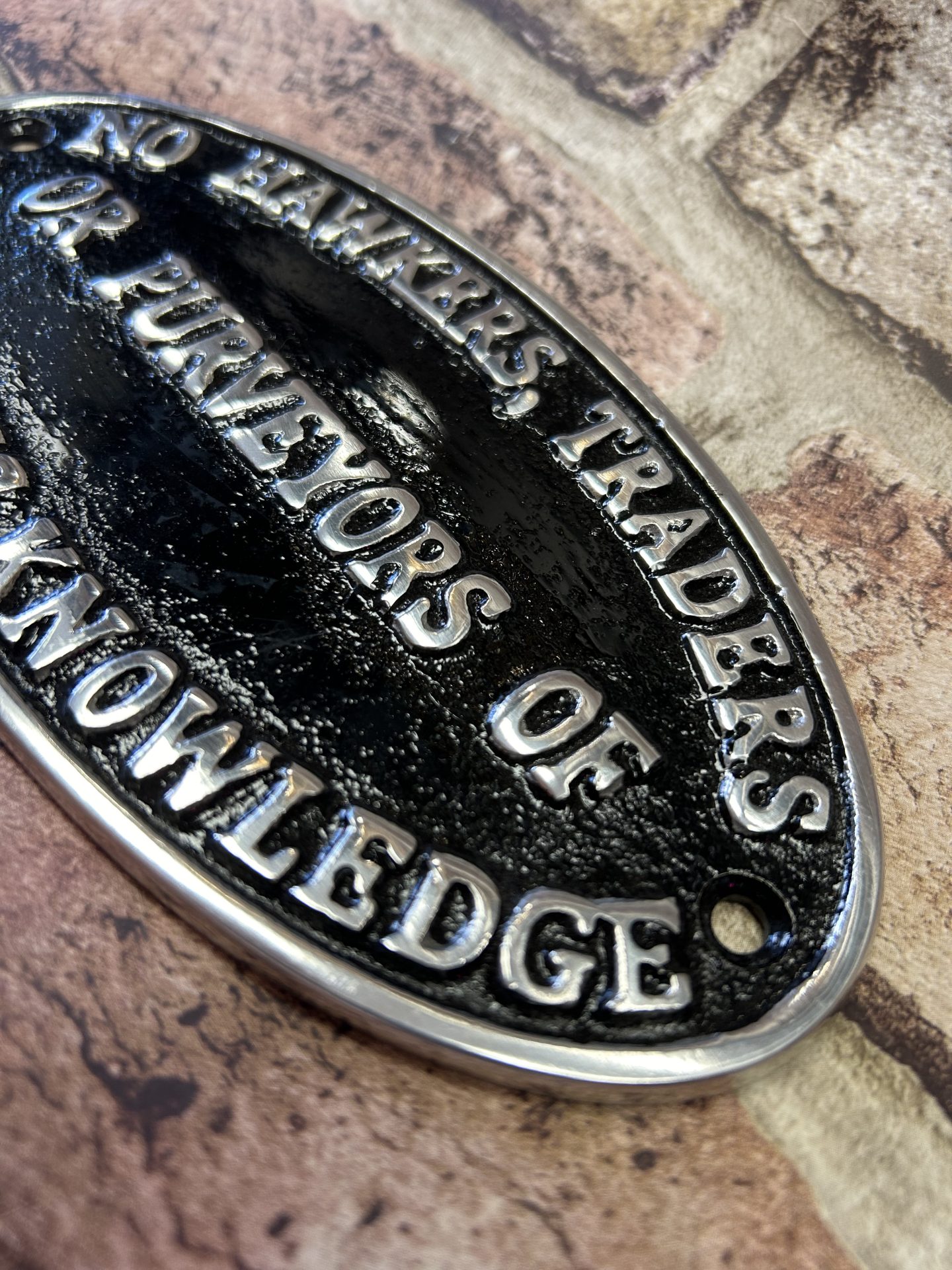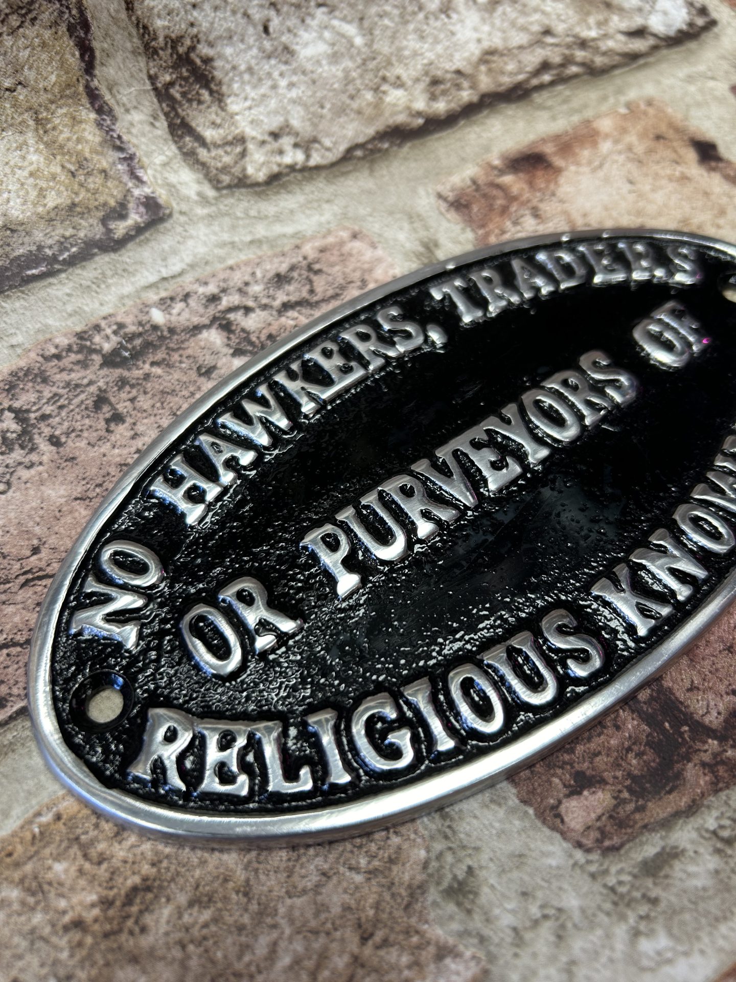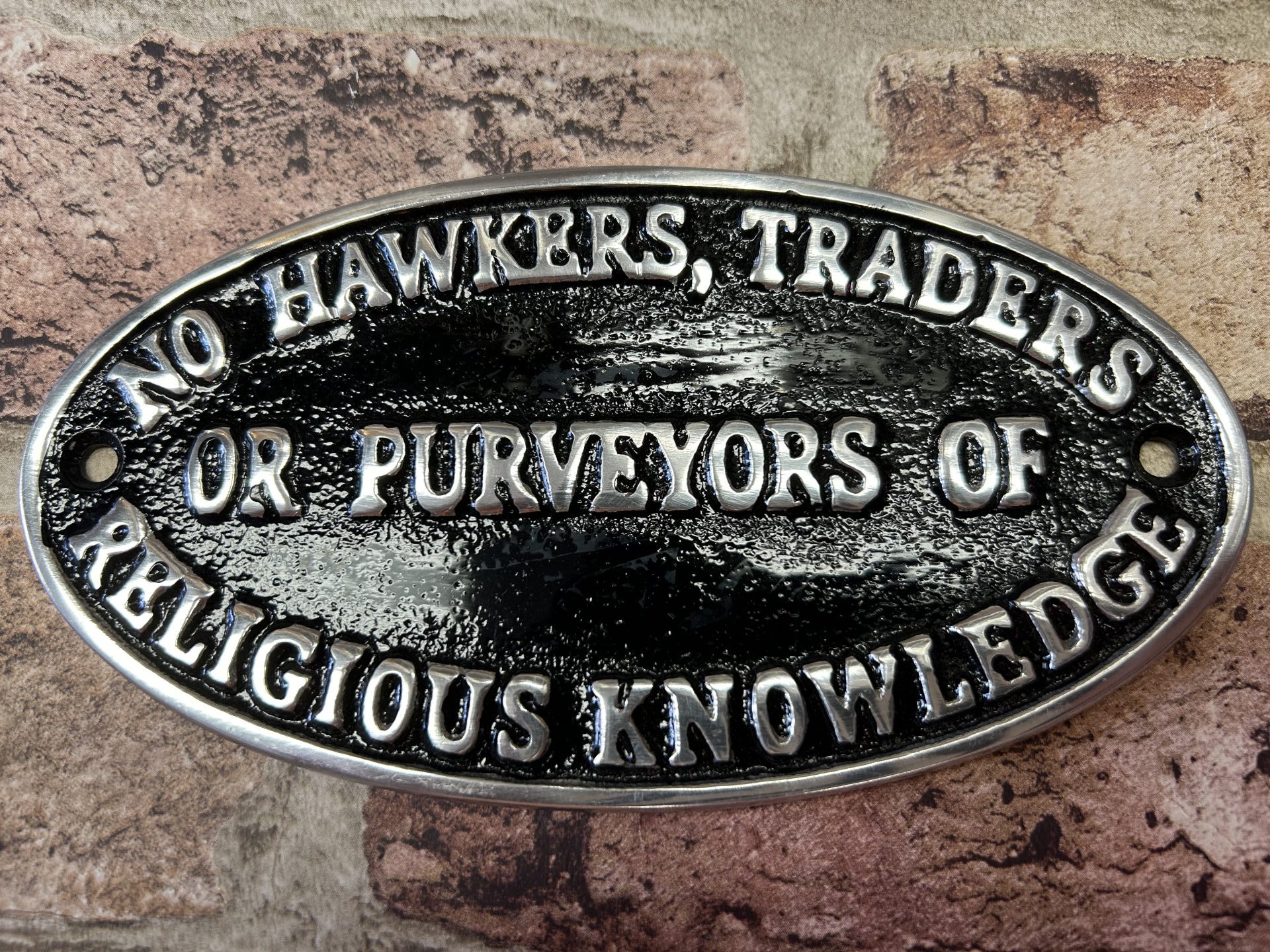 No Hawkers, Traders Or Purveyors Of Religious Knowledge, Polished aluminium wall plaque / sign.