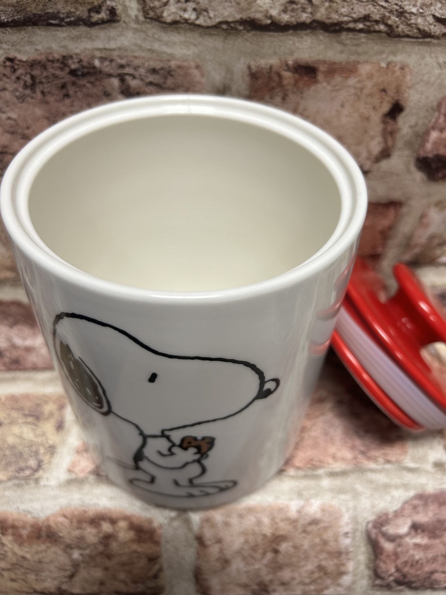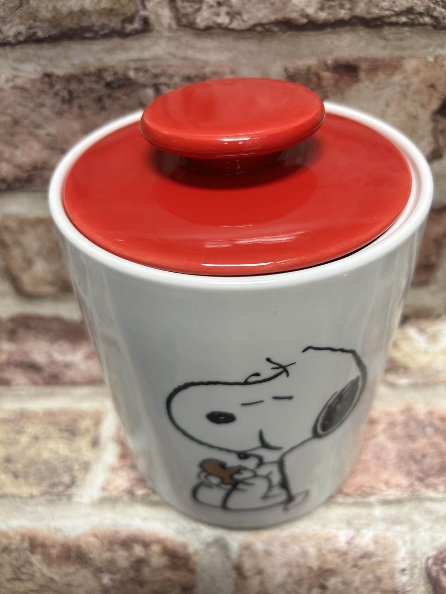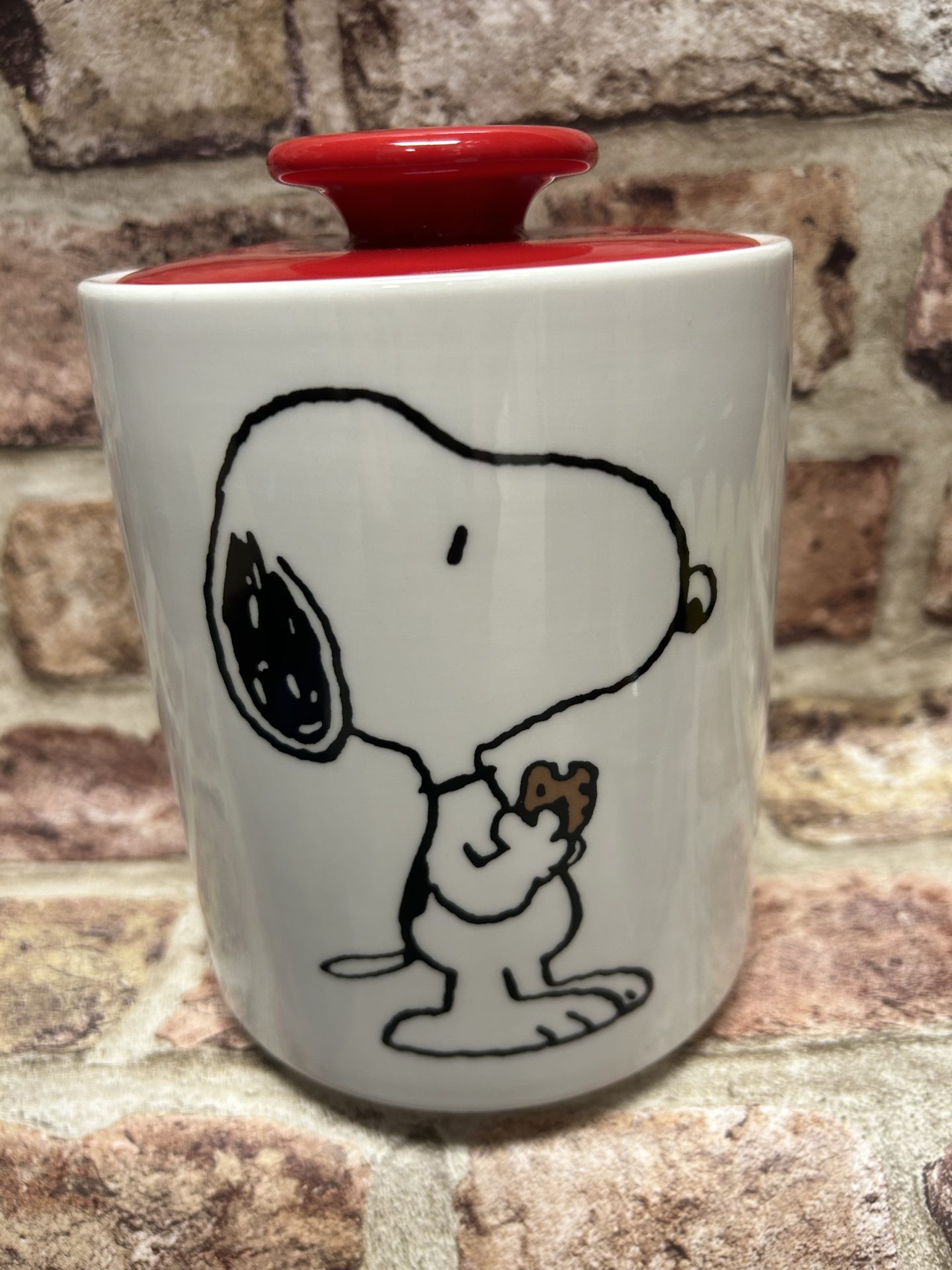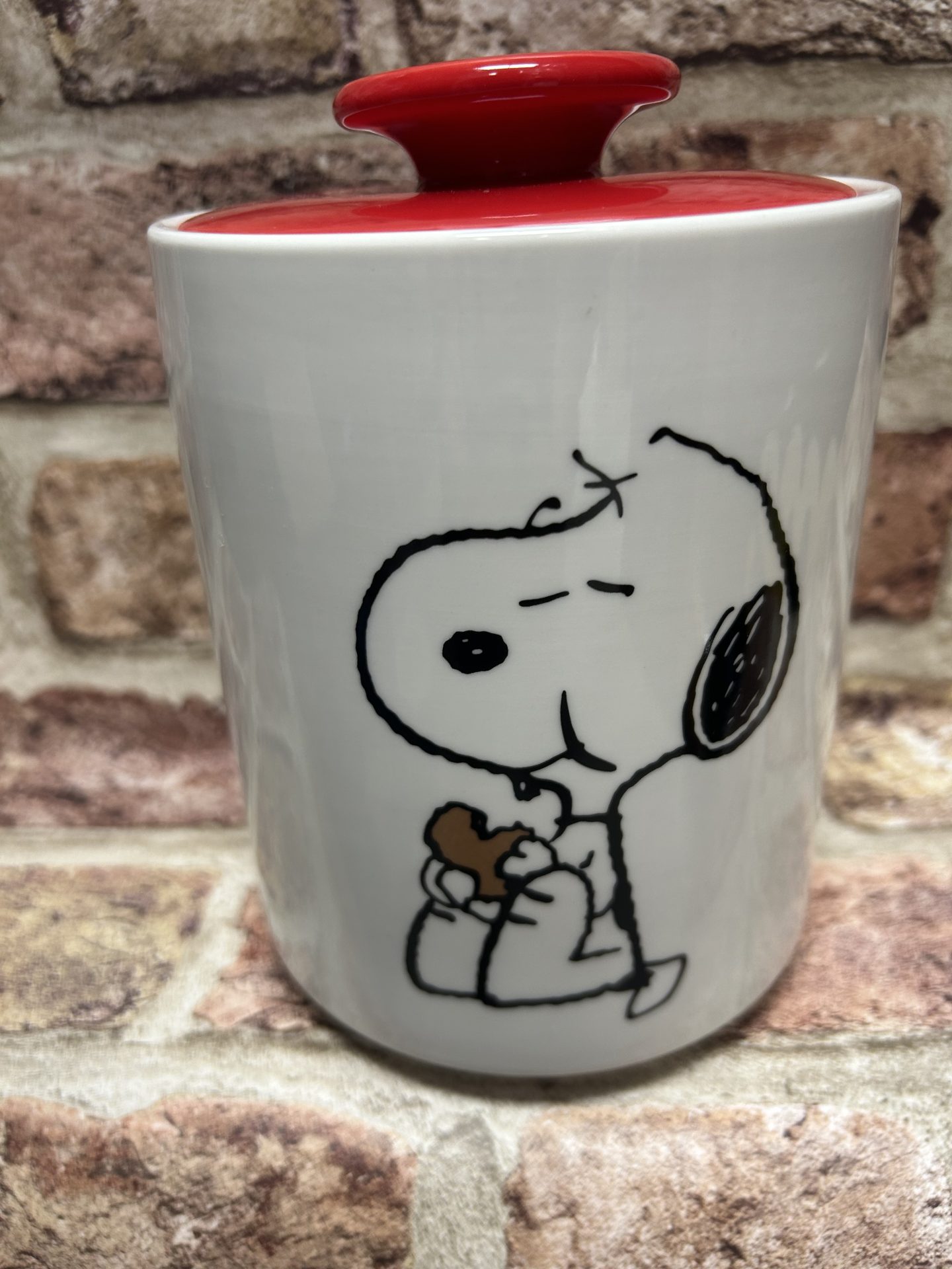 Snoopy loves a cookie! here he is on our new ceramic cookie jar – munching away! , different picture either side.