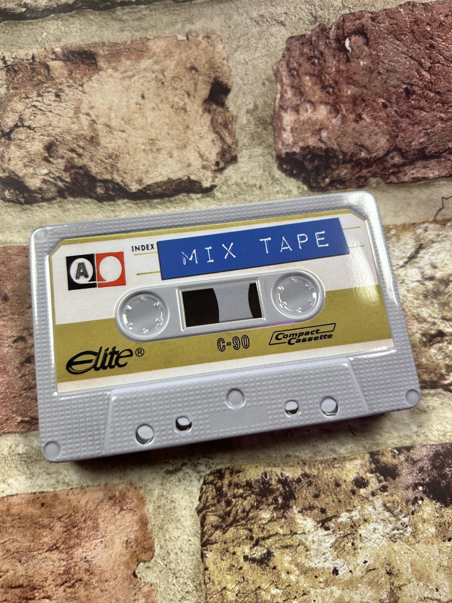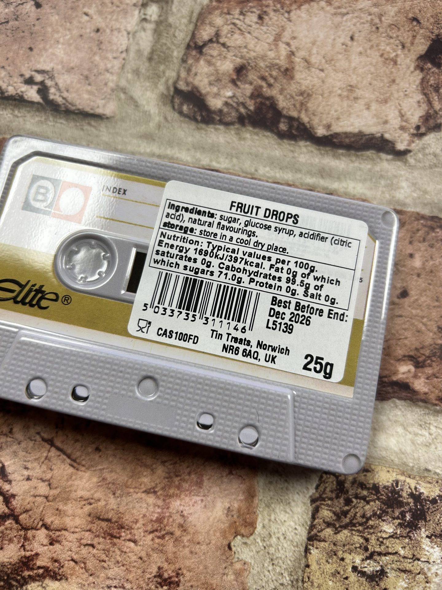 These retro designed Cassette shaped tins, make a perfect for gift , stocking filler or party favour. Each box contains an assortment of fruit drops, adding a sweet twist to vintage audio collection. Tin measurement: 10cm x 6.3cm x 1.8cm. Fill weight: 25gm, approx 10 fruit drops.