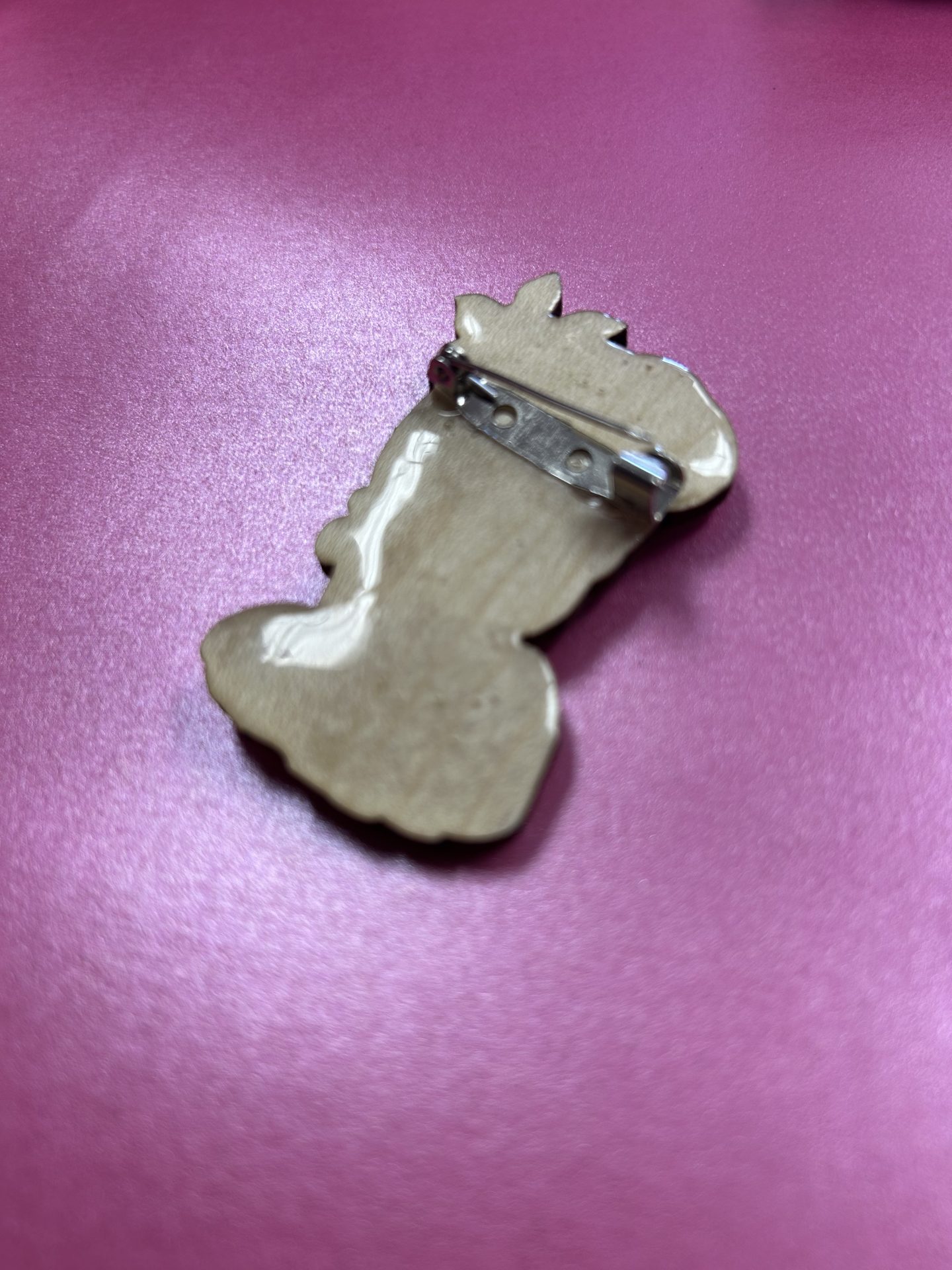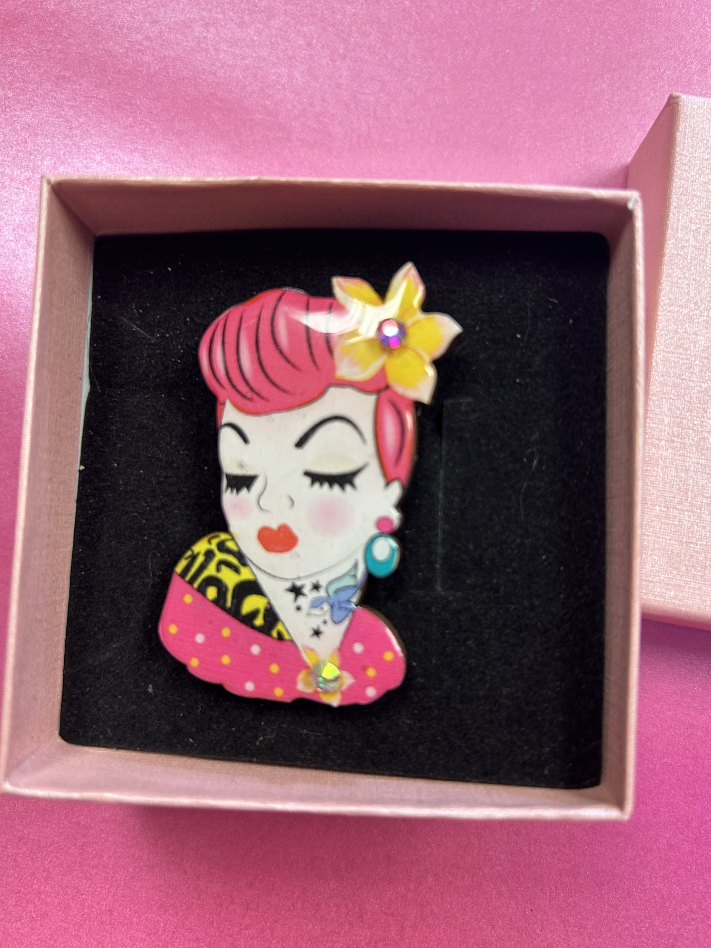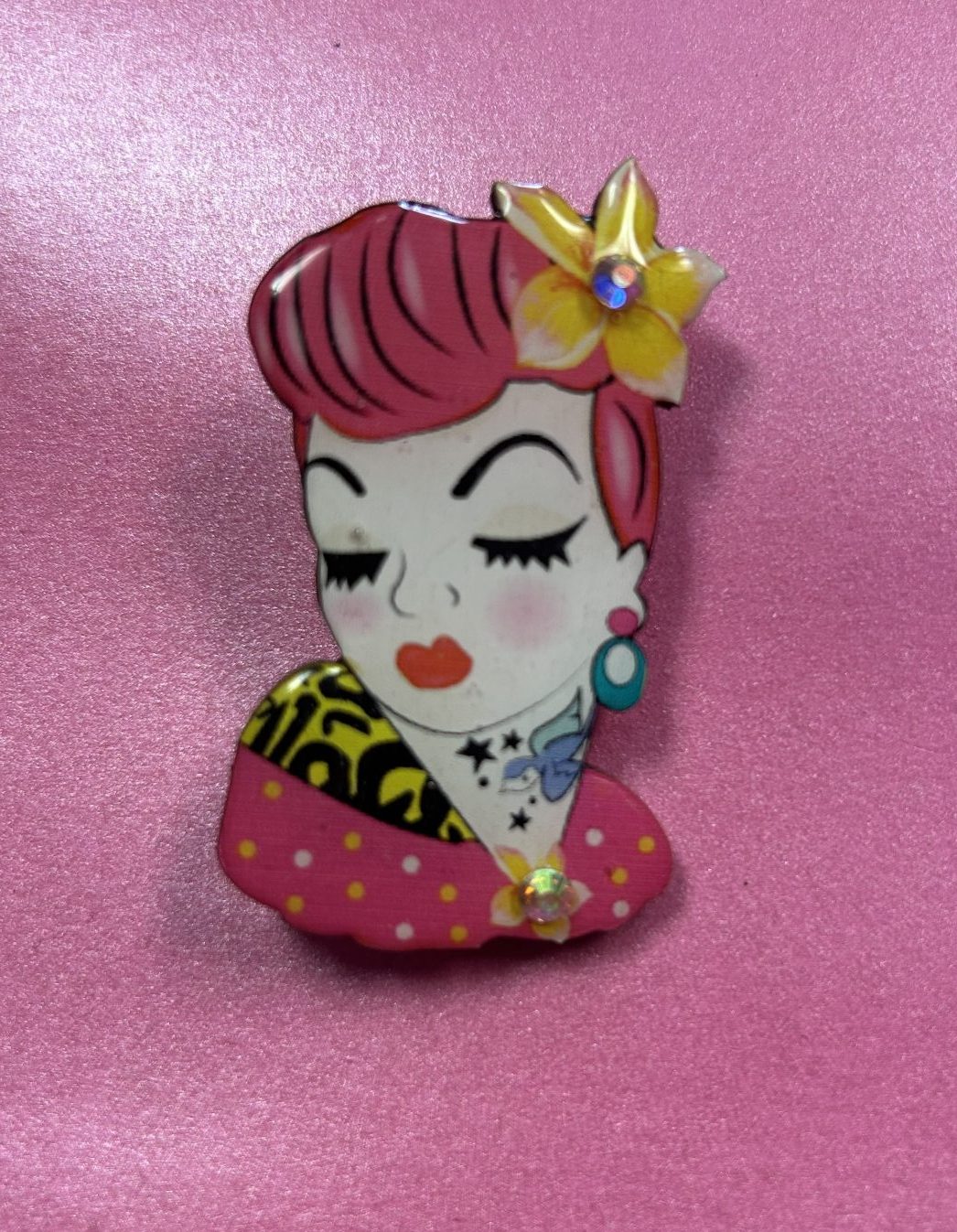 Super cute retro lady brooch in a rockabilly style ! she has bright lovely pink hair with a summer tropical flower – simply perfct for groovy pin up outfits. She’s absolutely fabulous! Illustrated in a 50s style she makes the perfect statement brooch for sure. She’s laser cut and been cured with resin and finished with little gems! Prefect size too – ready for your sweater or pretty dresses Brooch basics * Measurements – 5cm x 4cm * Pin up style accessory * Laser cut * Hard resin with gems.