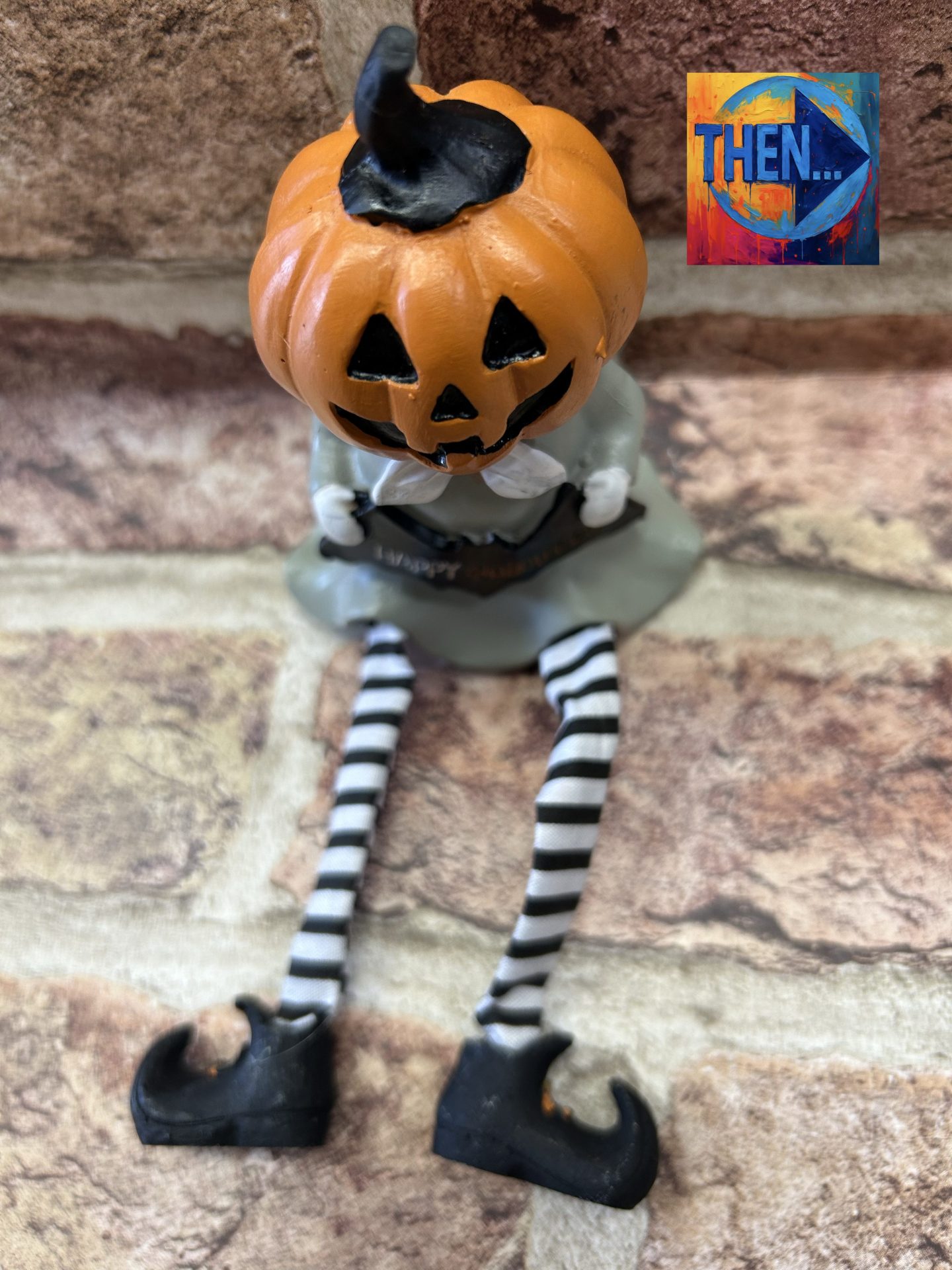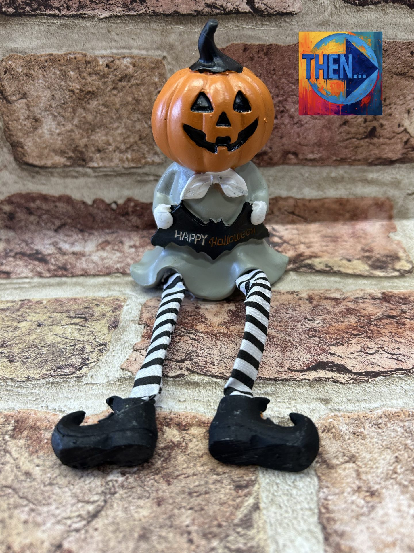 Sitting Ceramic pumpkin head figure with material legs holding sign