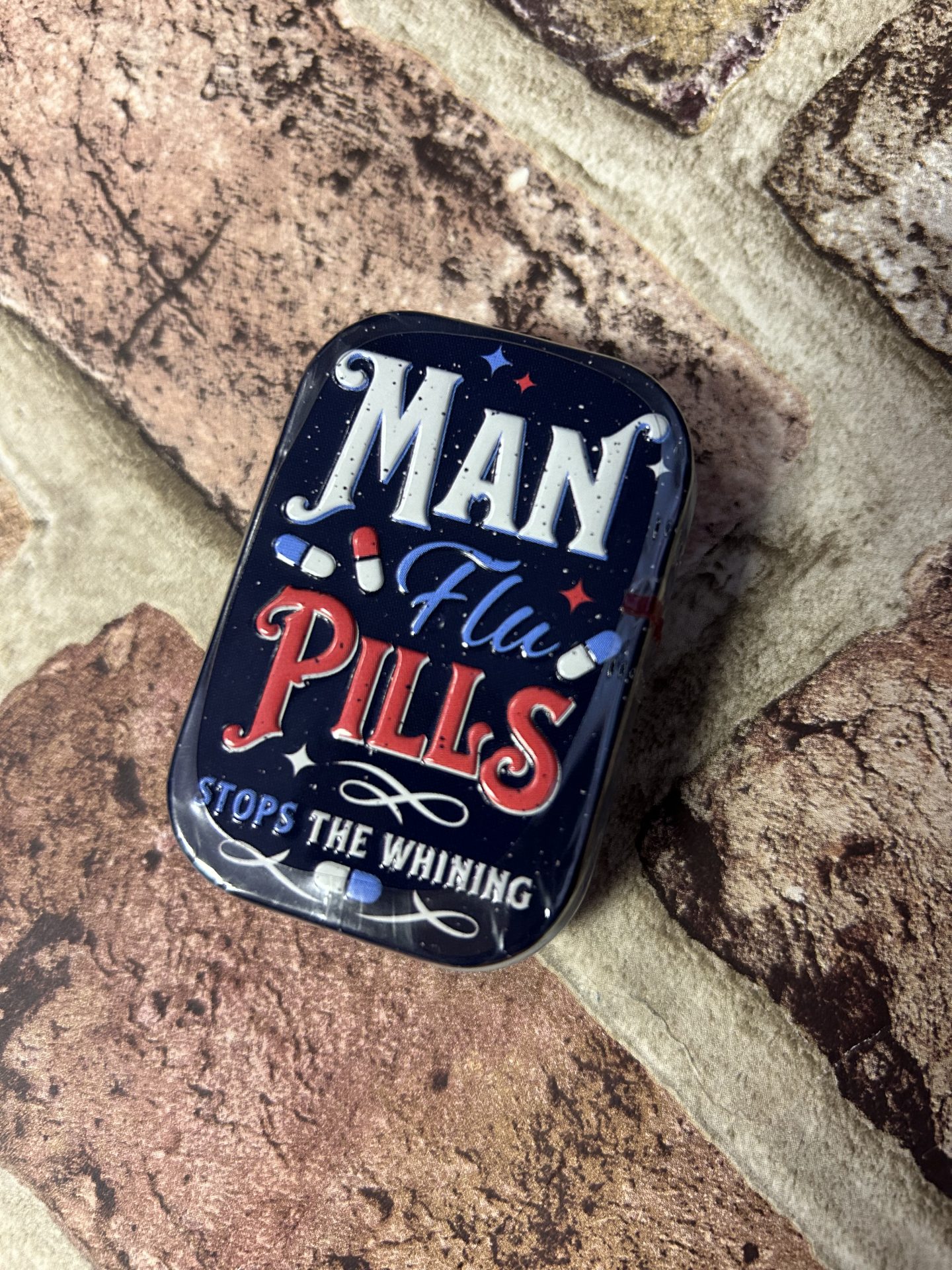 featuring a humorous cover “Man flu pills, stops the whining” artwork.