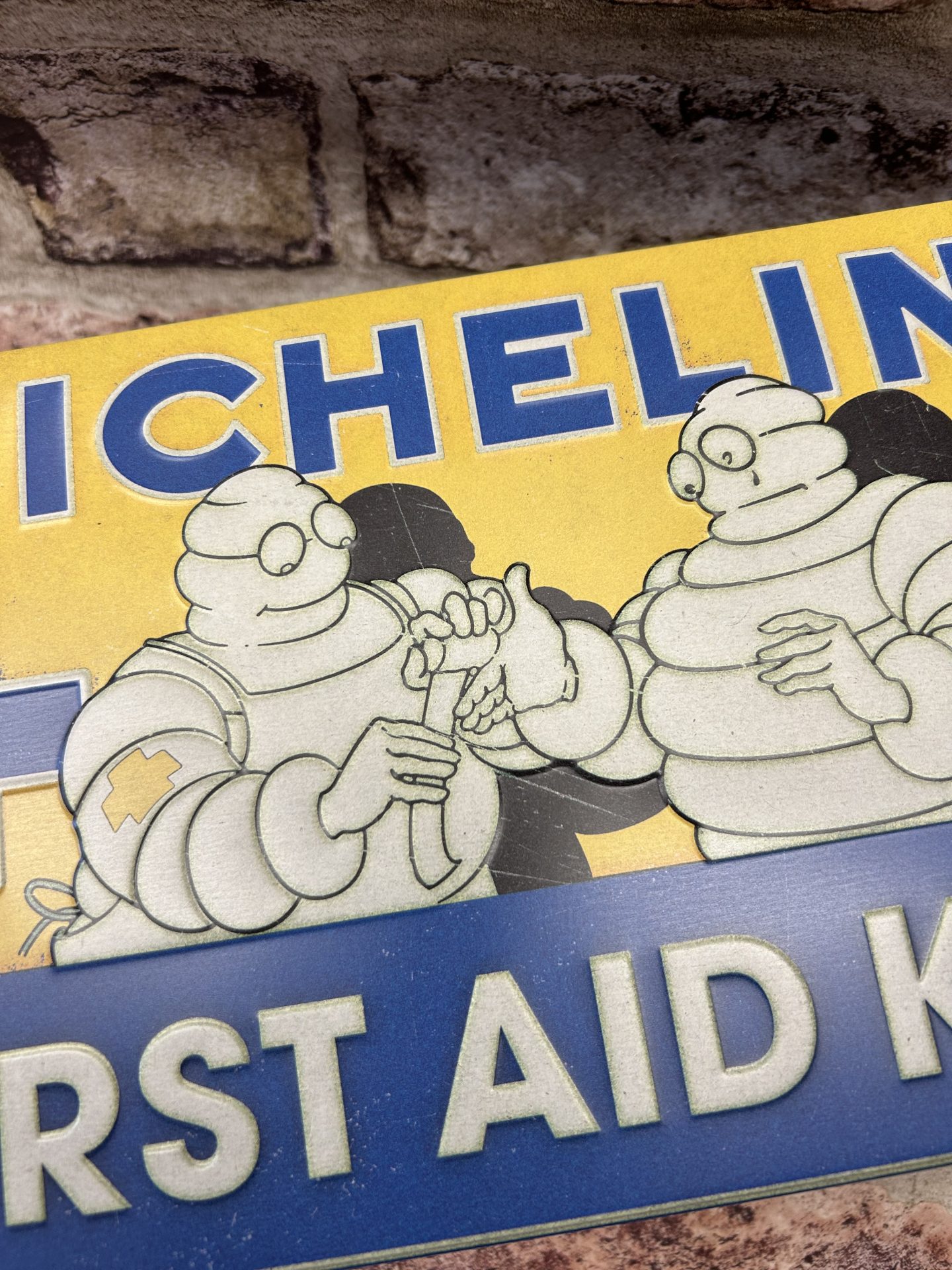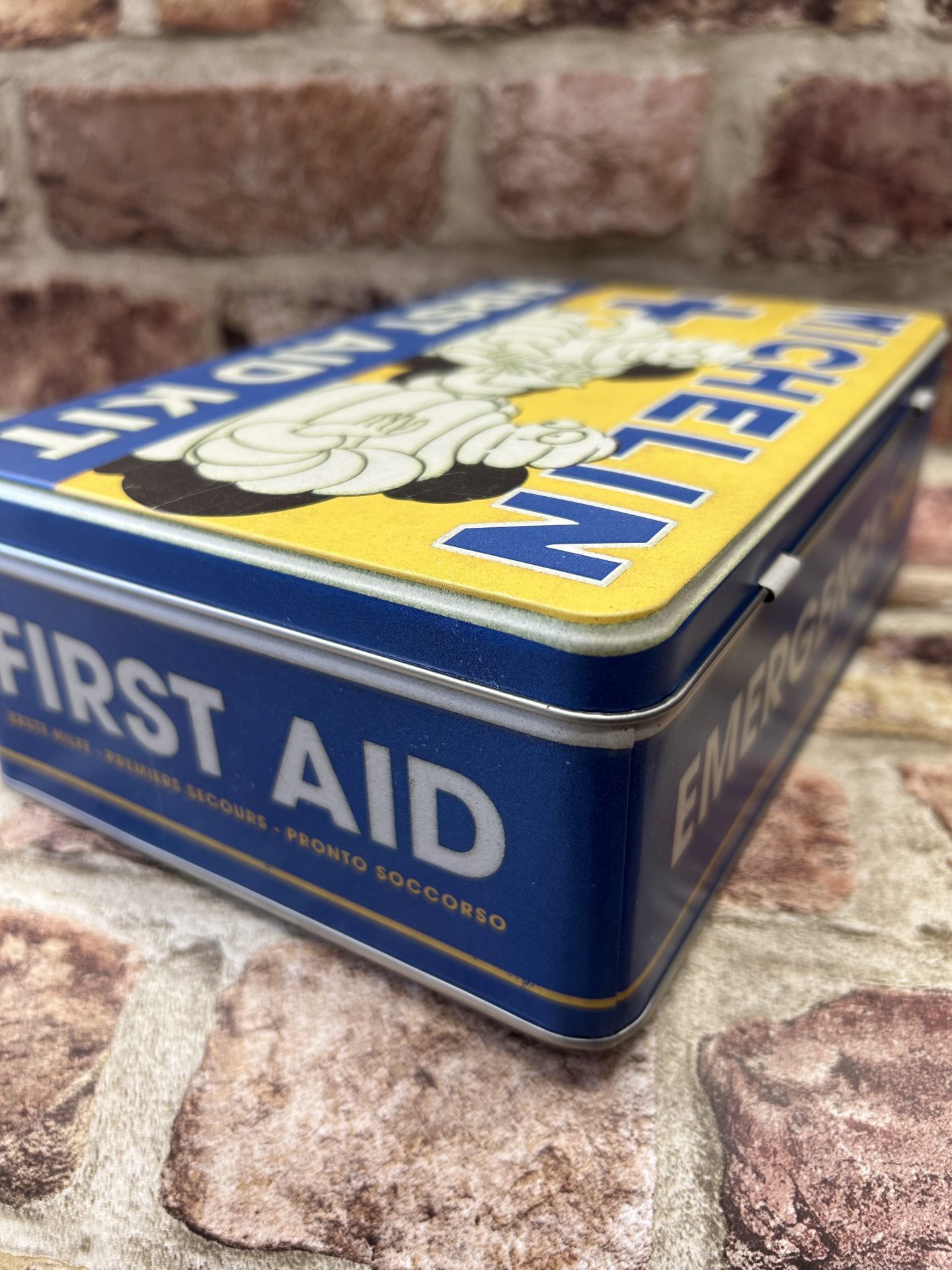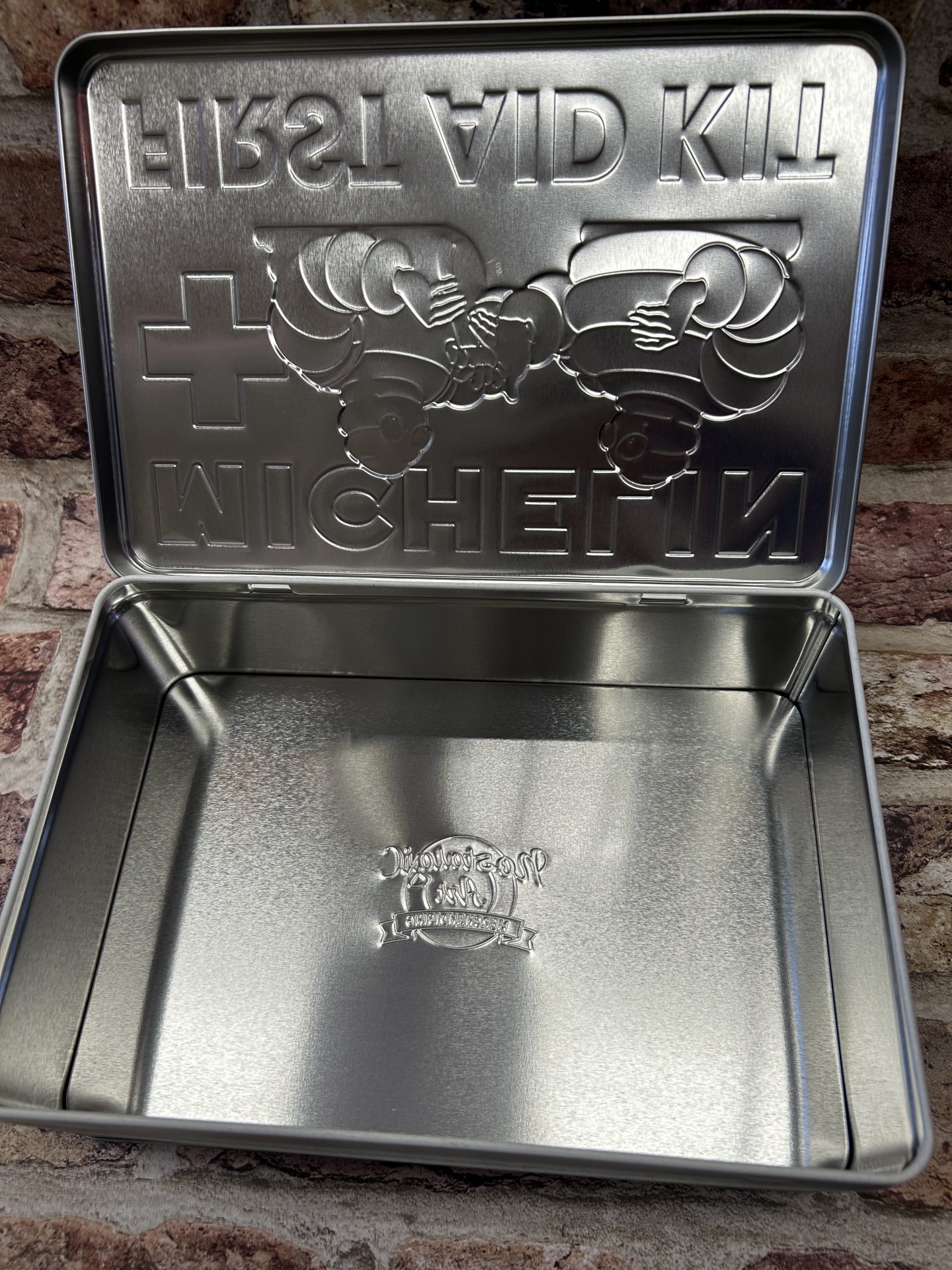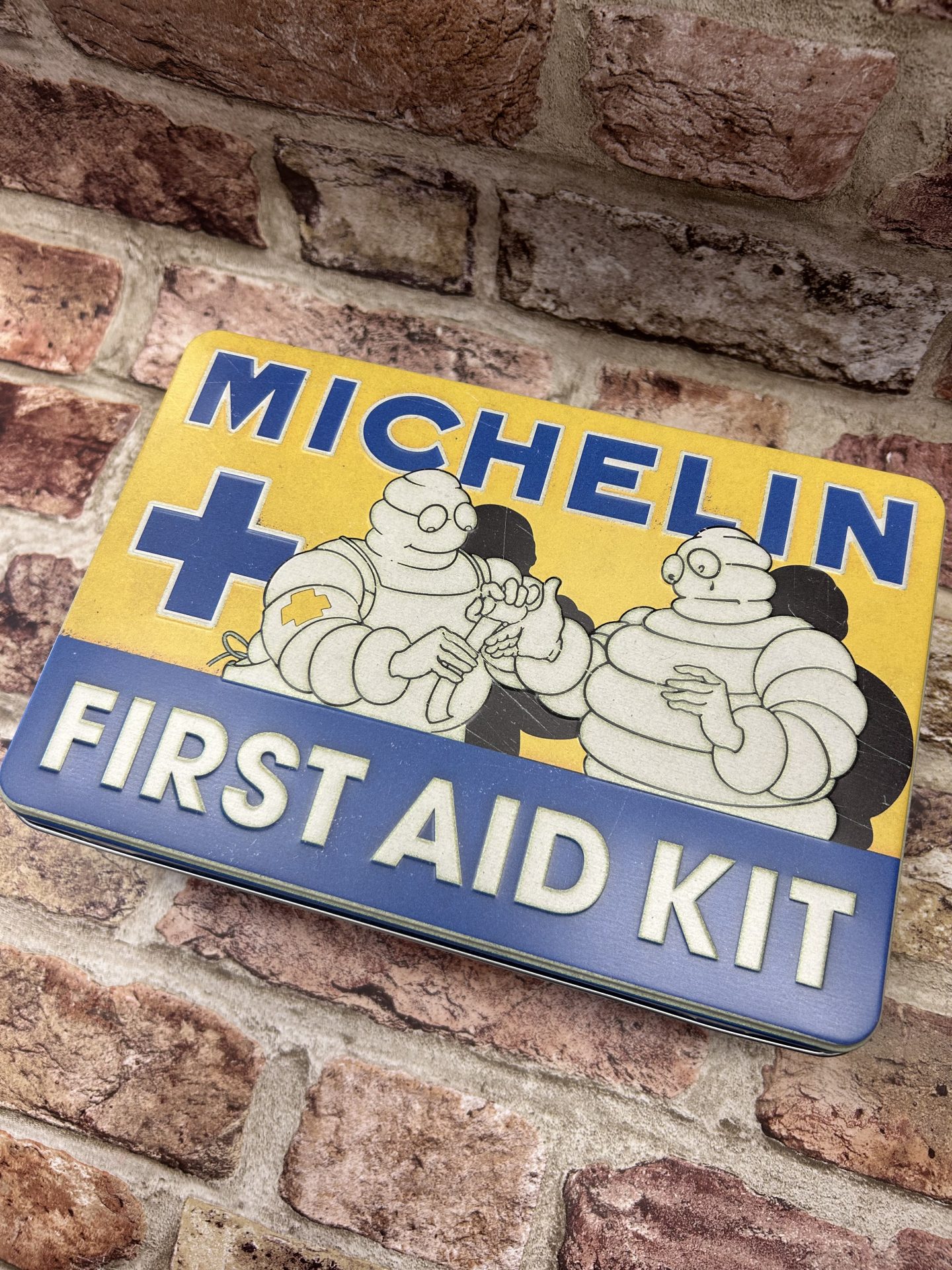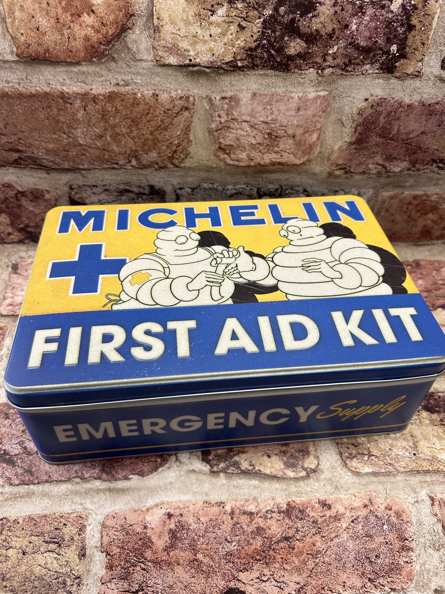 Metal Flat storage tin box with a hinged lid , with embossed Michelin Tyres First Aid Kit design.