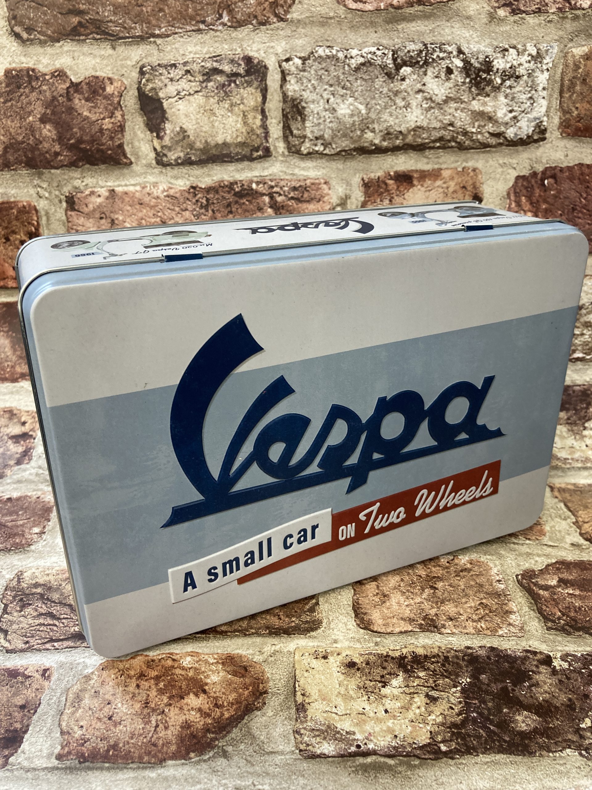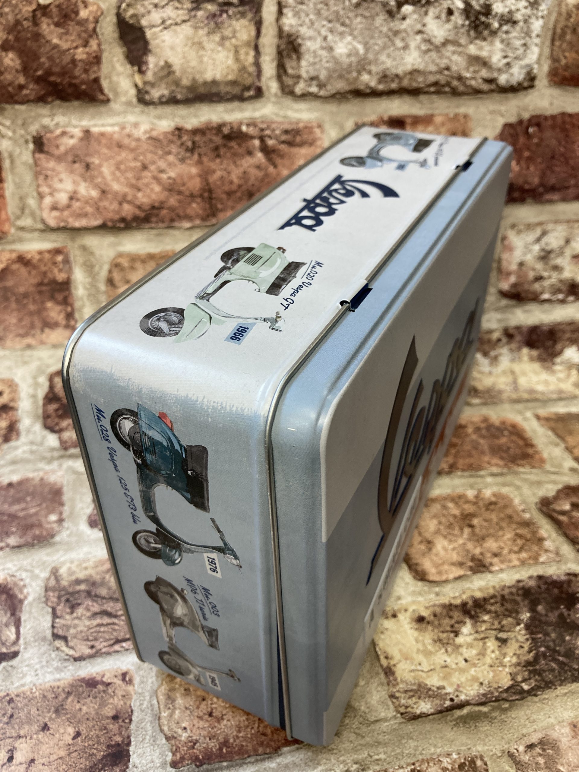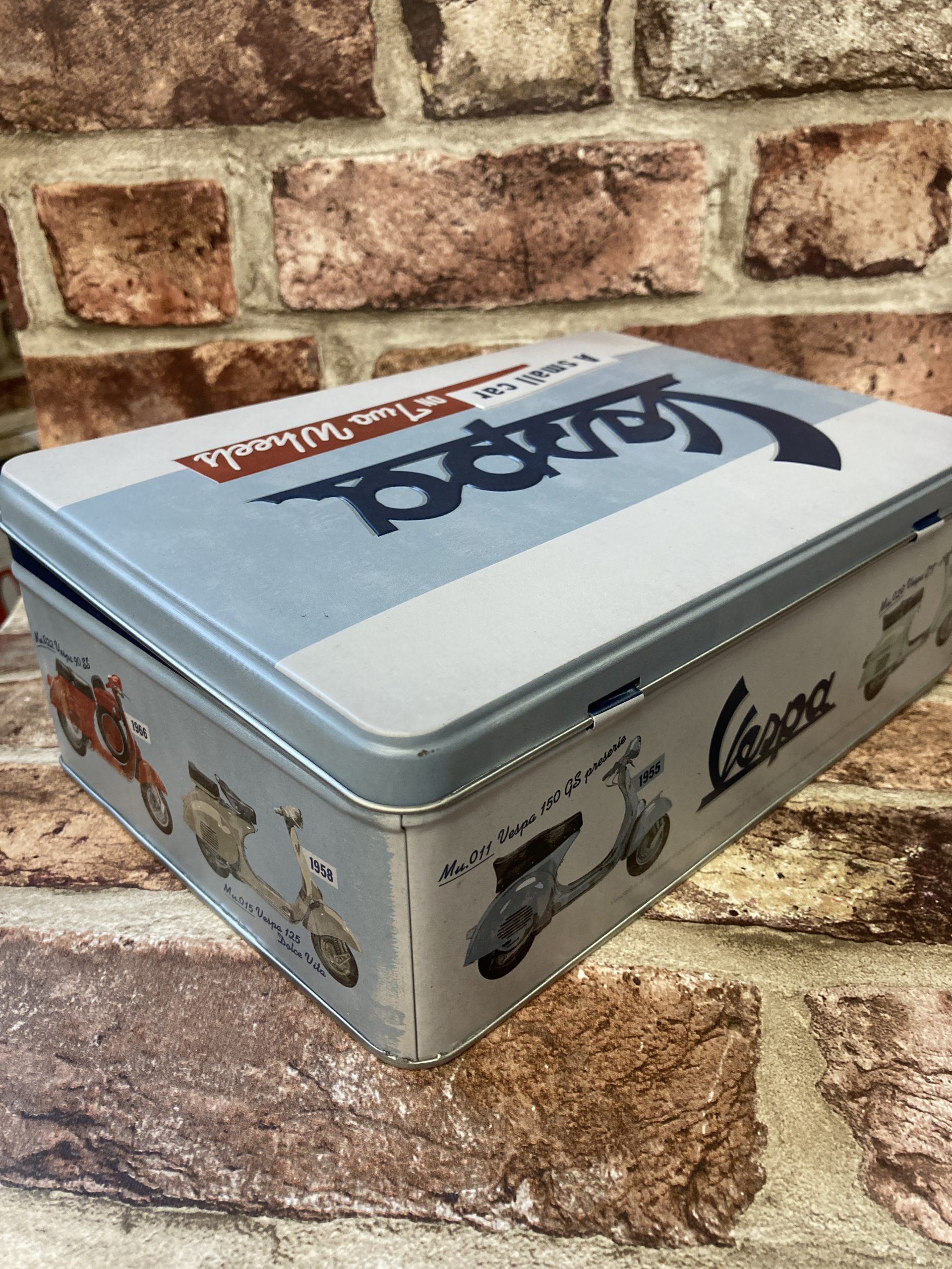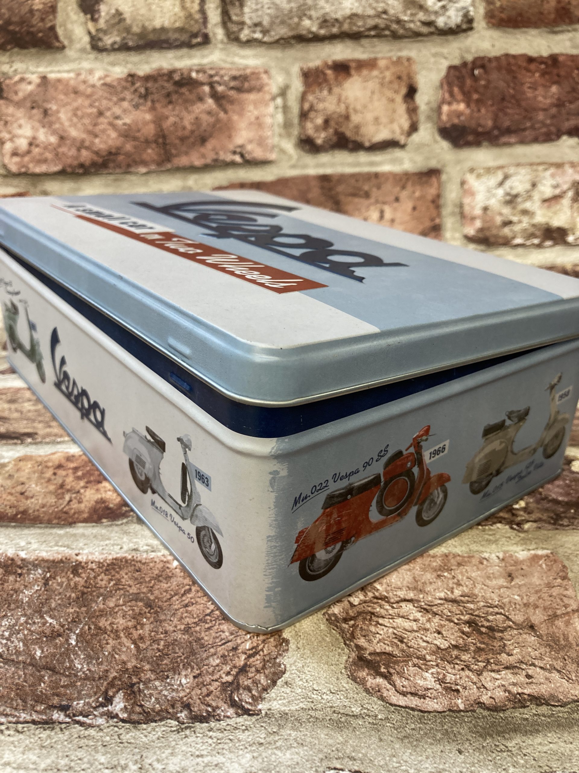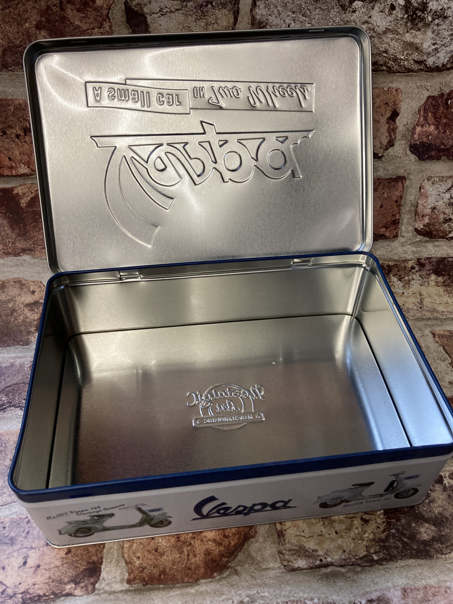 Metal Flat storage tin box with a hinged lid , with embossed Vespa Design incorporating a chart of some of the great classic models.