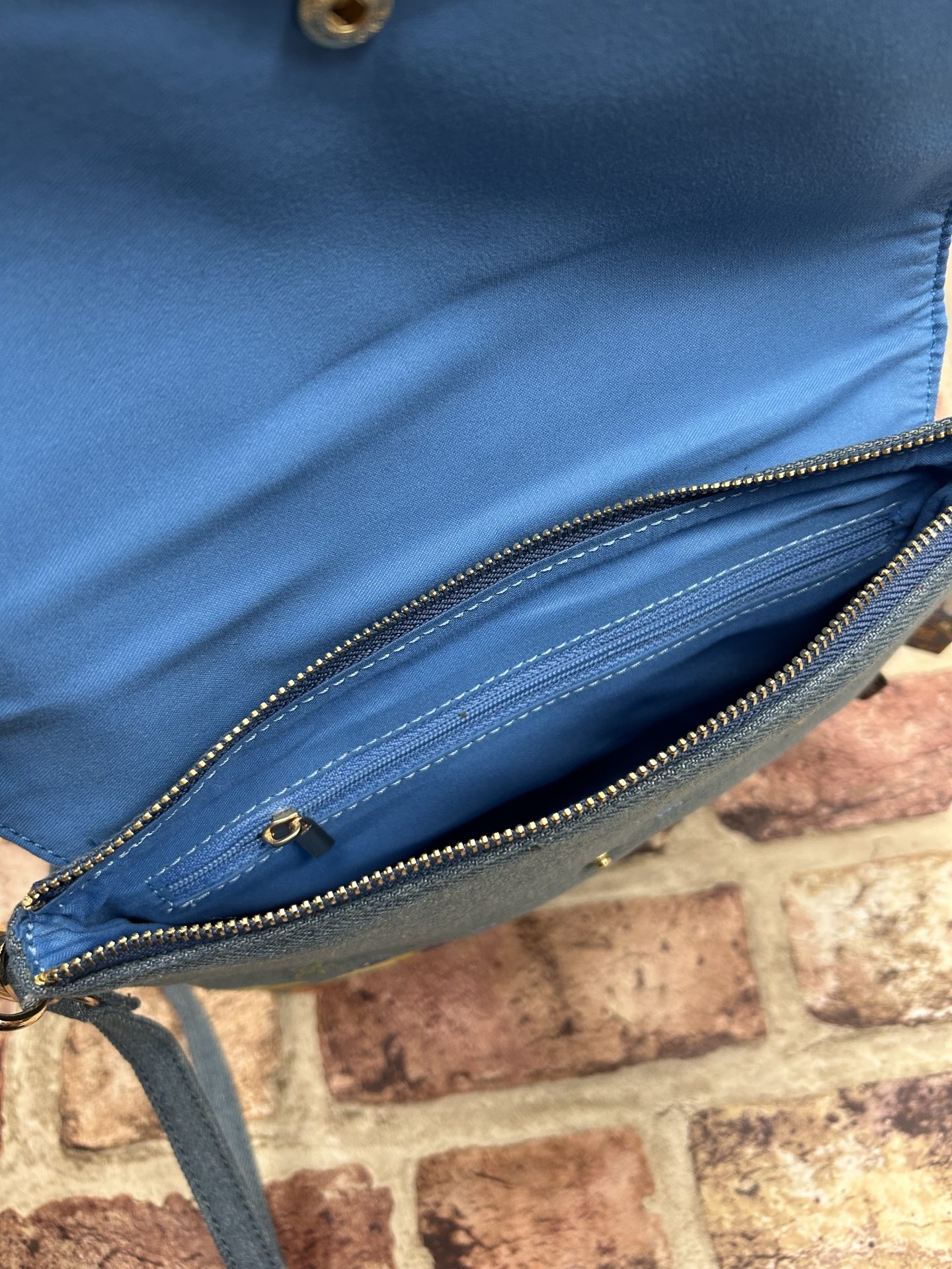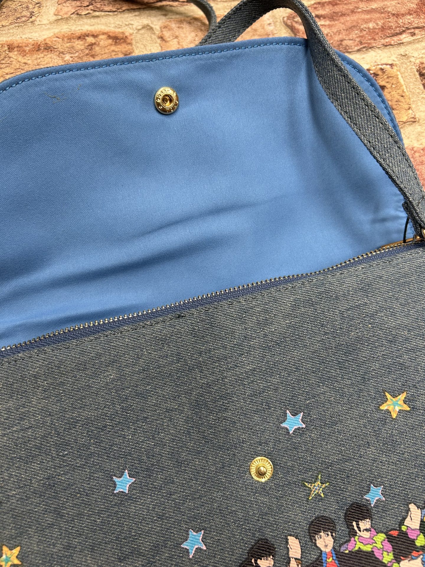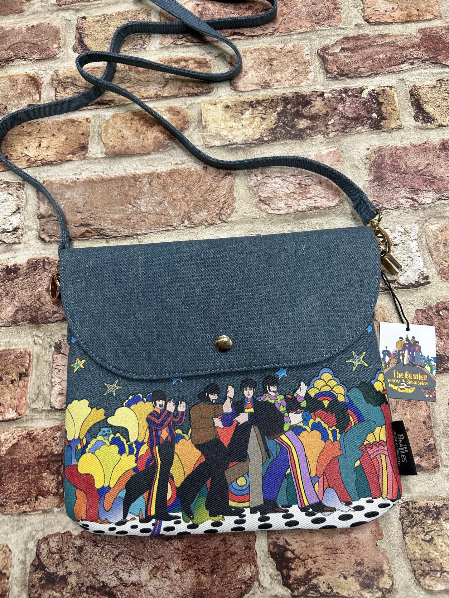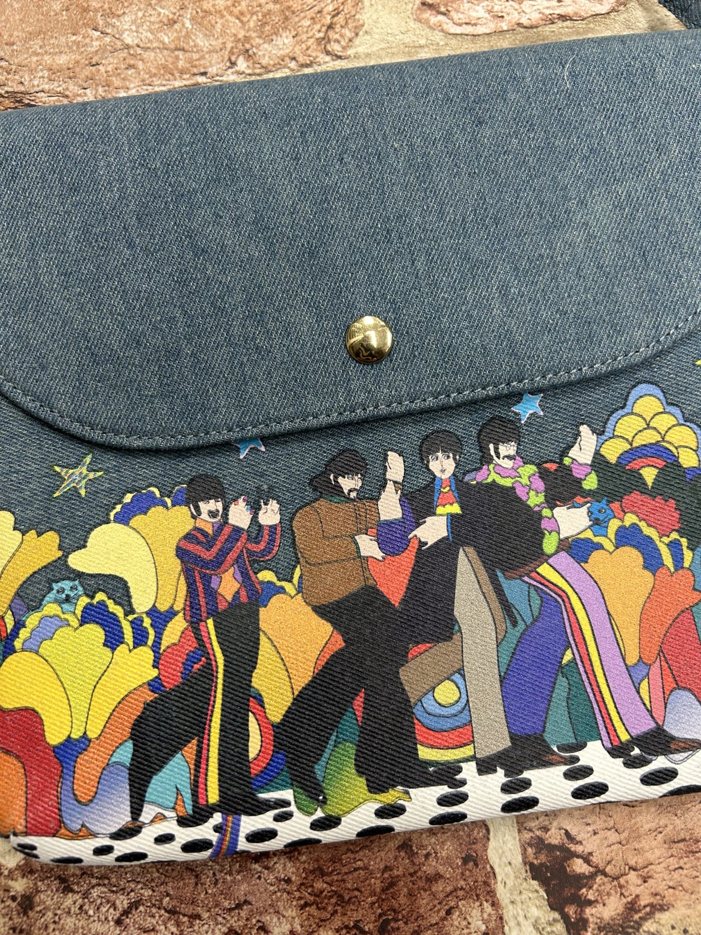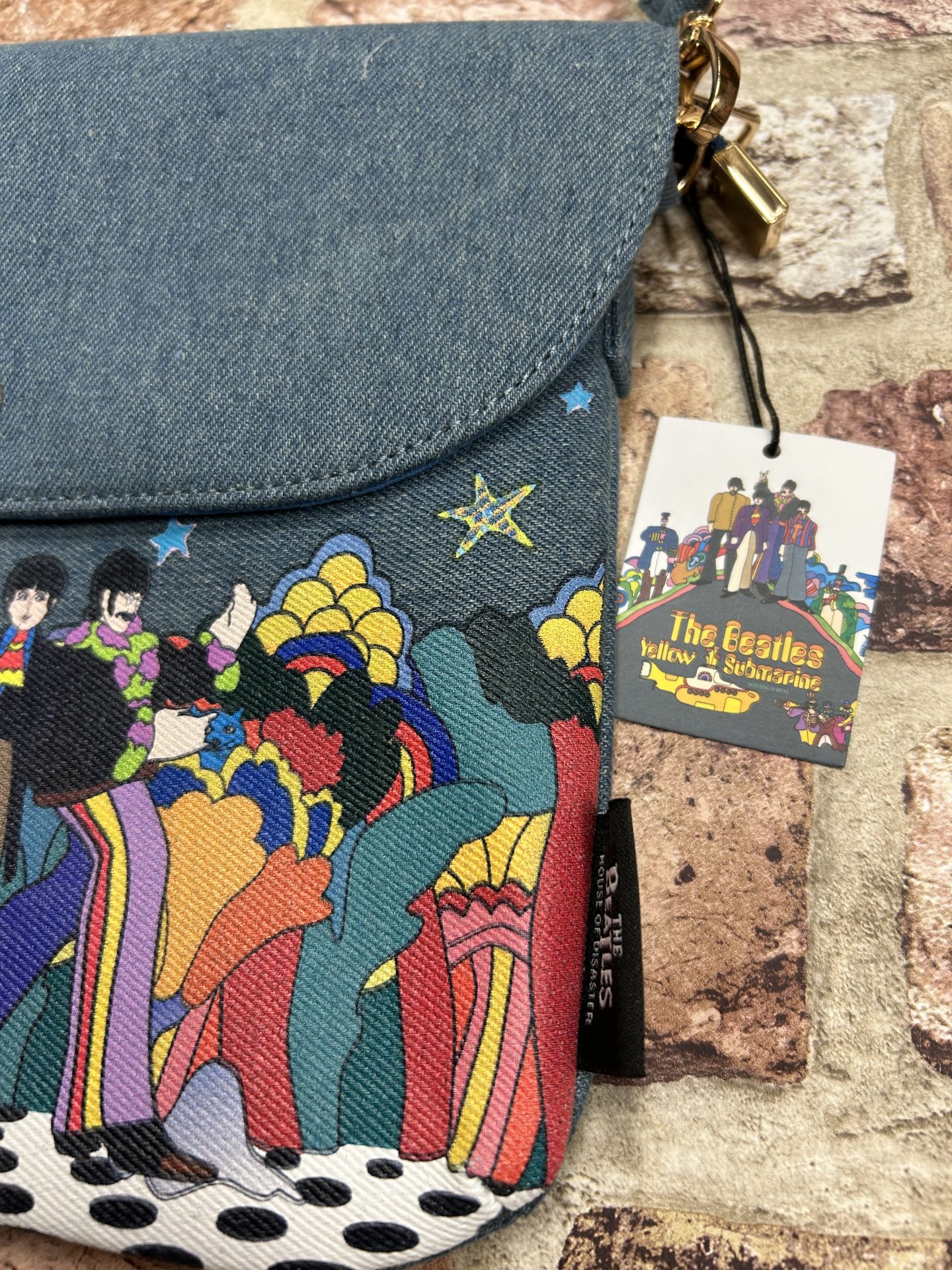 Features: All aboard! Come along for a ride of peace and love with John, Paul, Ringo and George and discover a vivid underwater world of psychedelic creatures, unusual plants, and… a flying glove?This bold denim bag is decorated head-to-toe in printed patches featuring the artwork by German artist Heinz Edelmann, who illustrated the iconic Yellow Submarine film. With gold hardware and a mid-wash denim, this bag will add a little edge to any outfit, while capturing the spirit of The Beatles. This mini bag has a zip and a flap to keep your belongings extra secure, and an inside zip pocket for bits such as your house keys or driving license. Treat yourself and spread the message that all you need is love.
