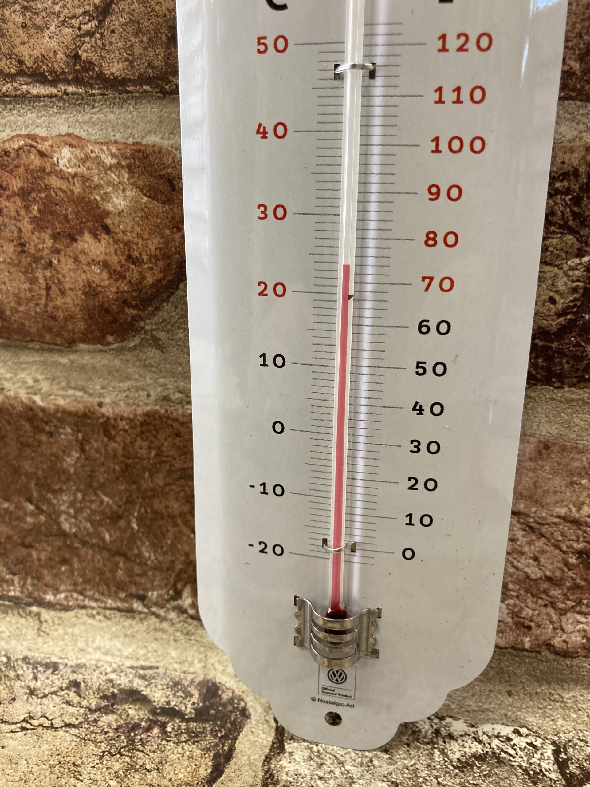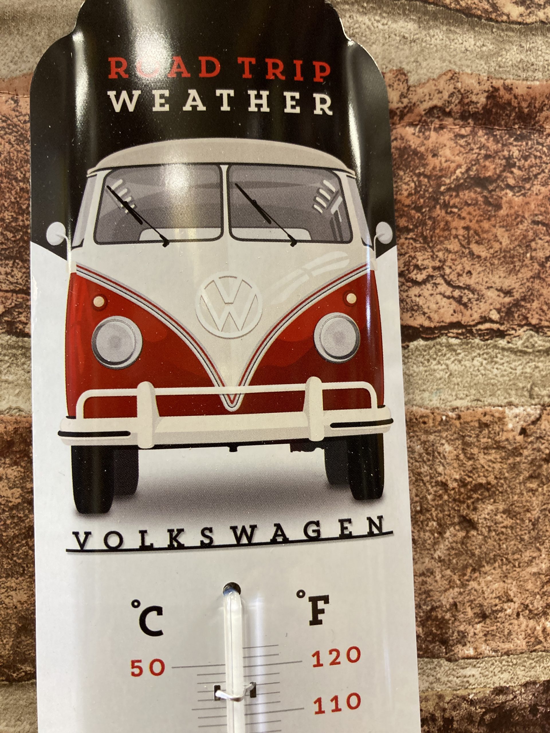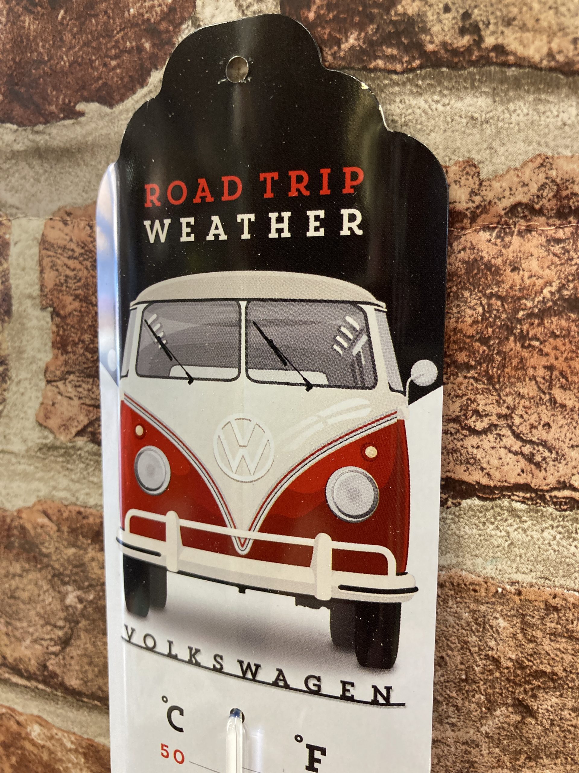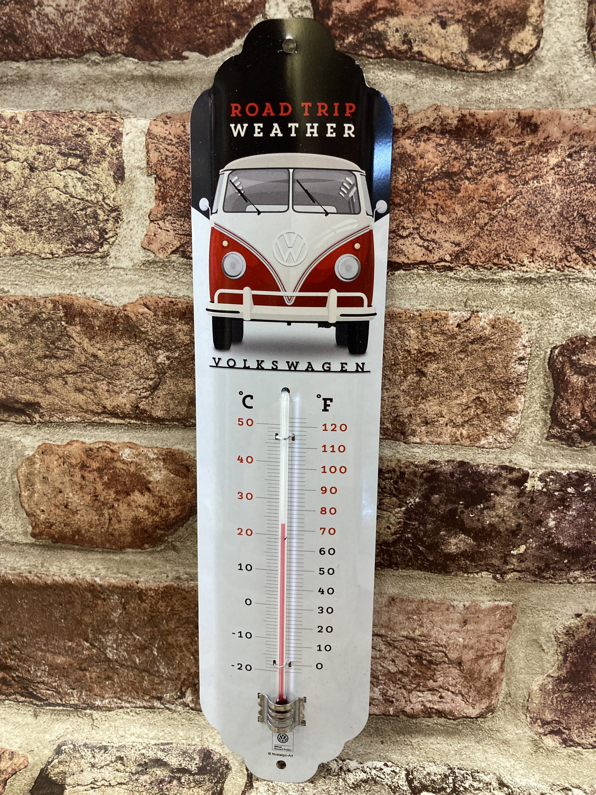 Metal Retro look wall thermometer, With Volkswagen Bulli (bus) and Road trip weather artwork. Officially licensed product. 6.5cm x 28cm high